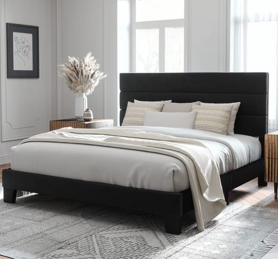 King Size Platform Bed Frame with Velvet Upholstered Headboard and Wooden Slats Support, Fully Upholstered Mattress Foundation/No Box Spring Needed/Easy Assembly, Black