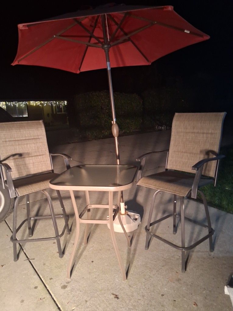 2 chairs in excellent condition and table with umbrella. Bar height. And the chairs swivel.
