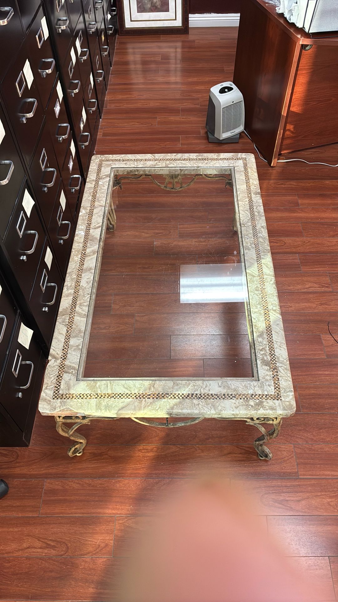 Metal frame tile and forged glass coffin table. 50 - 30 inches 18 inches high Some corners tiles are broken see pictures