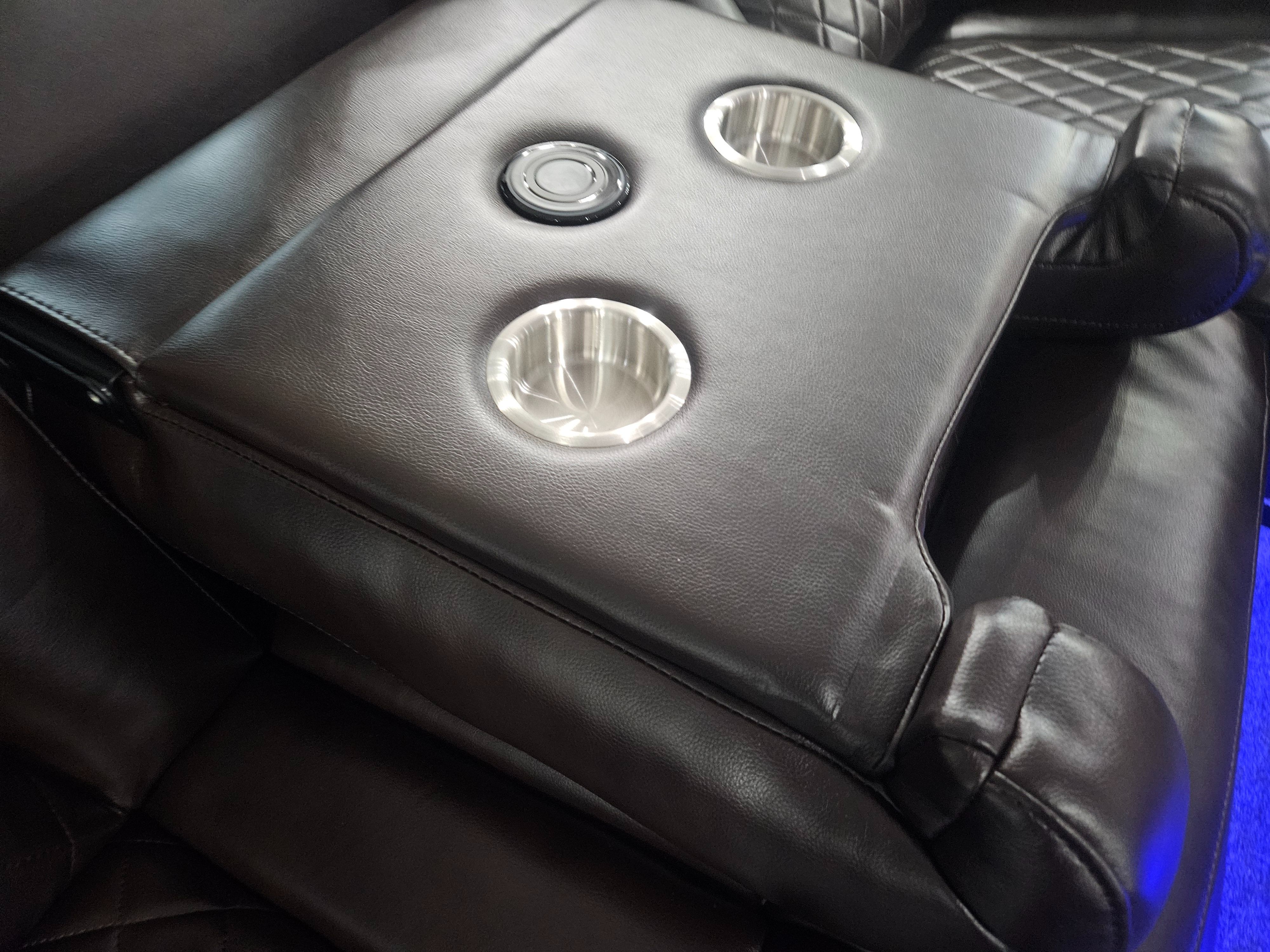 Brand new black bonded leather motorized reclining sofa + loveseat with cup holders, Bluetooth speakers, cup holders, and charging ports