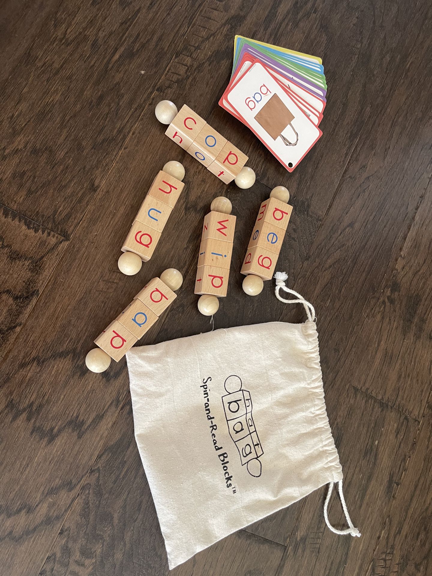 Includes 5 spin and read blocks, flashcards, and a bag to keep it all together.