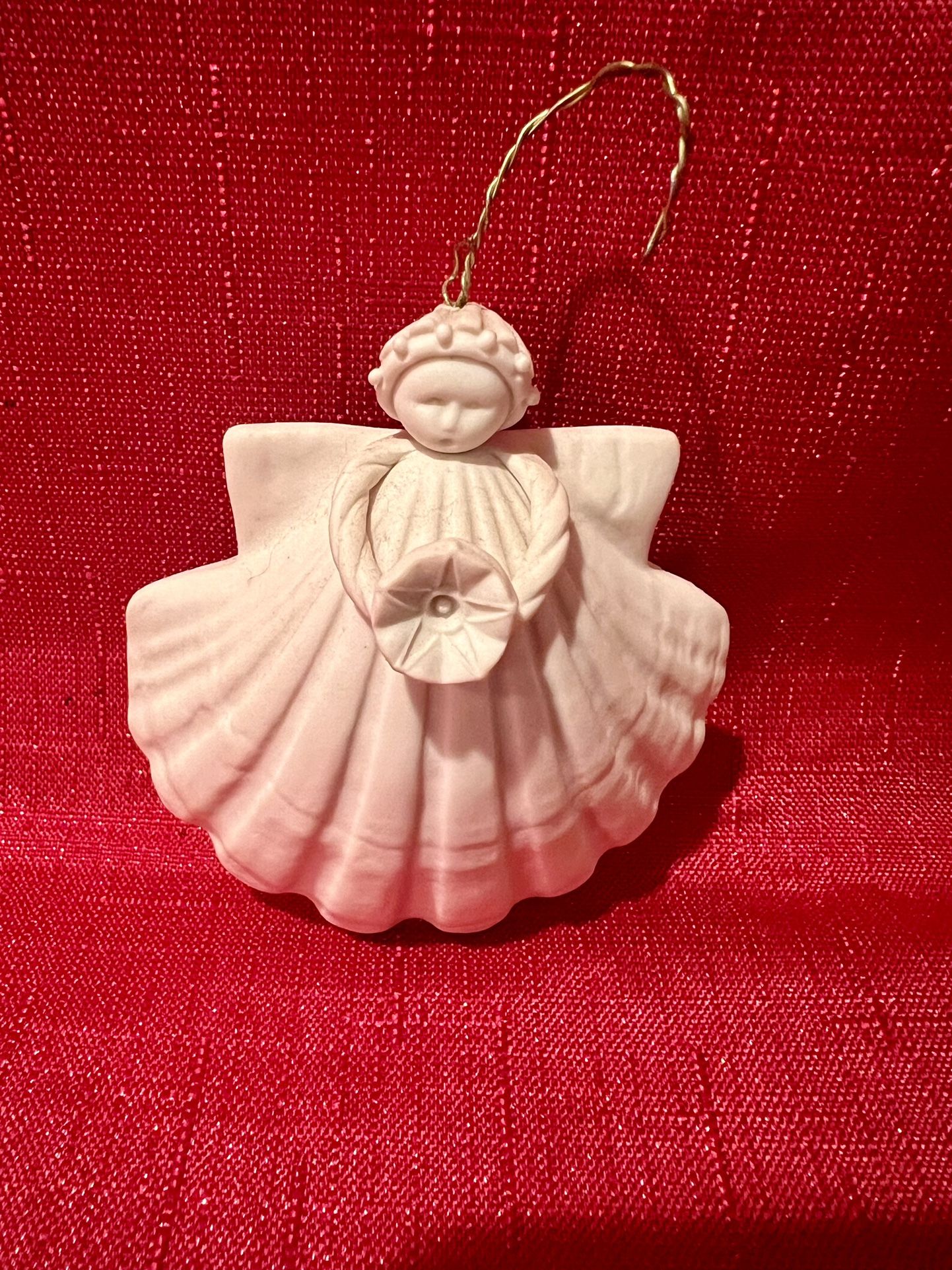 This beautiful 3" handmade angel ornament by Margaret Furlong in 1996 is made of white bisque porcelain. The angel holds a morning glory.