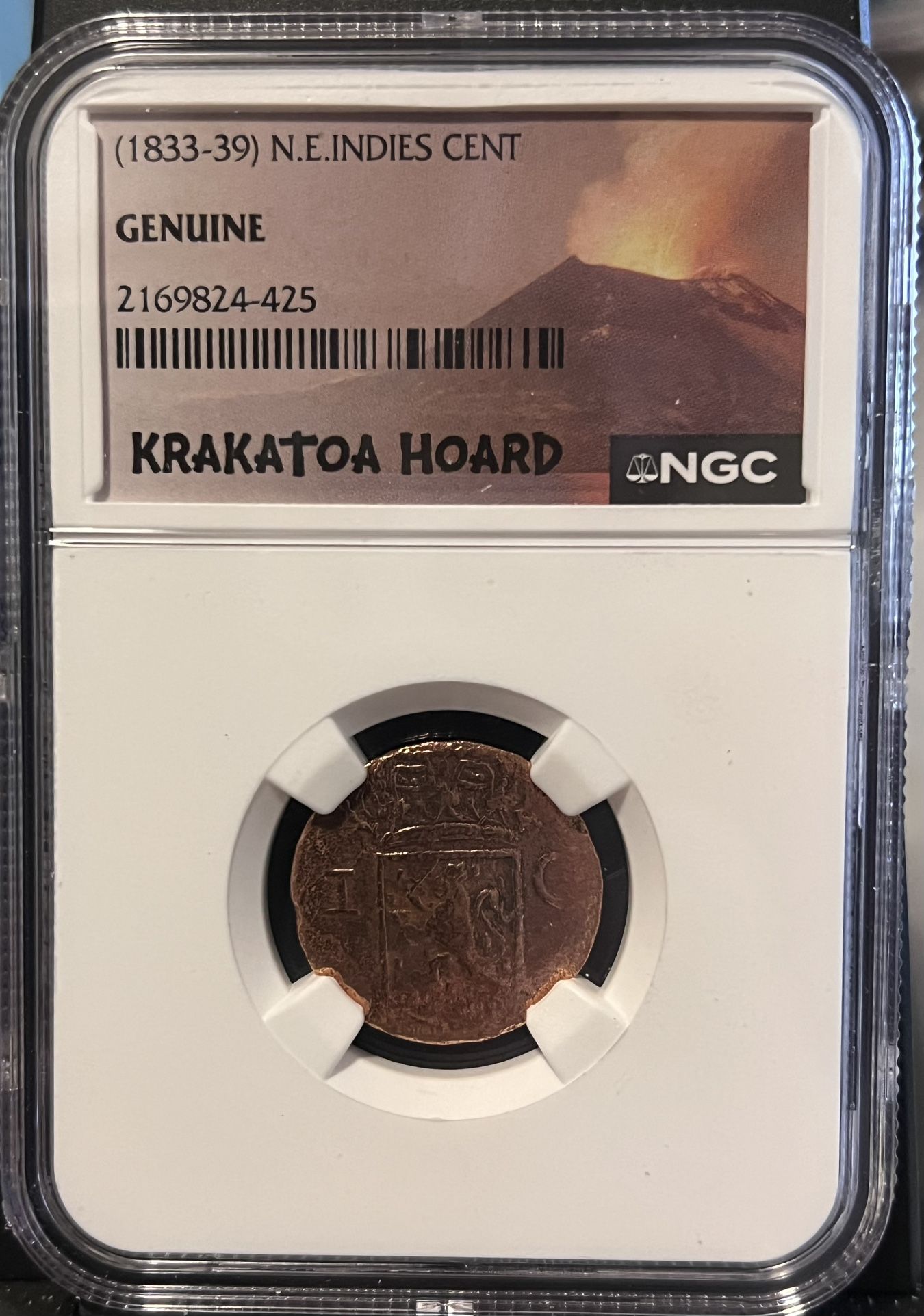 1833 to 1839 Netherlands East Indies Cent, Sumatra Island • Dutch Colonial Copper Coin • Krakatoa Volcano Hoard Label • Graded NGC Genuine