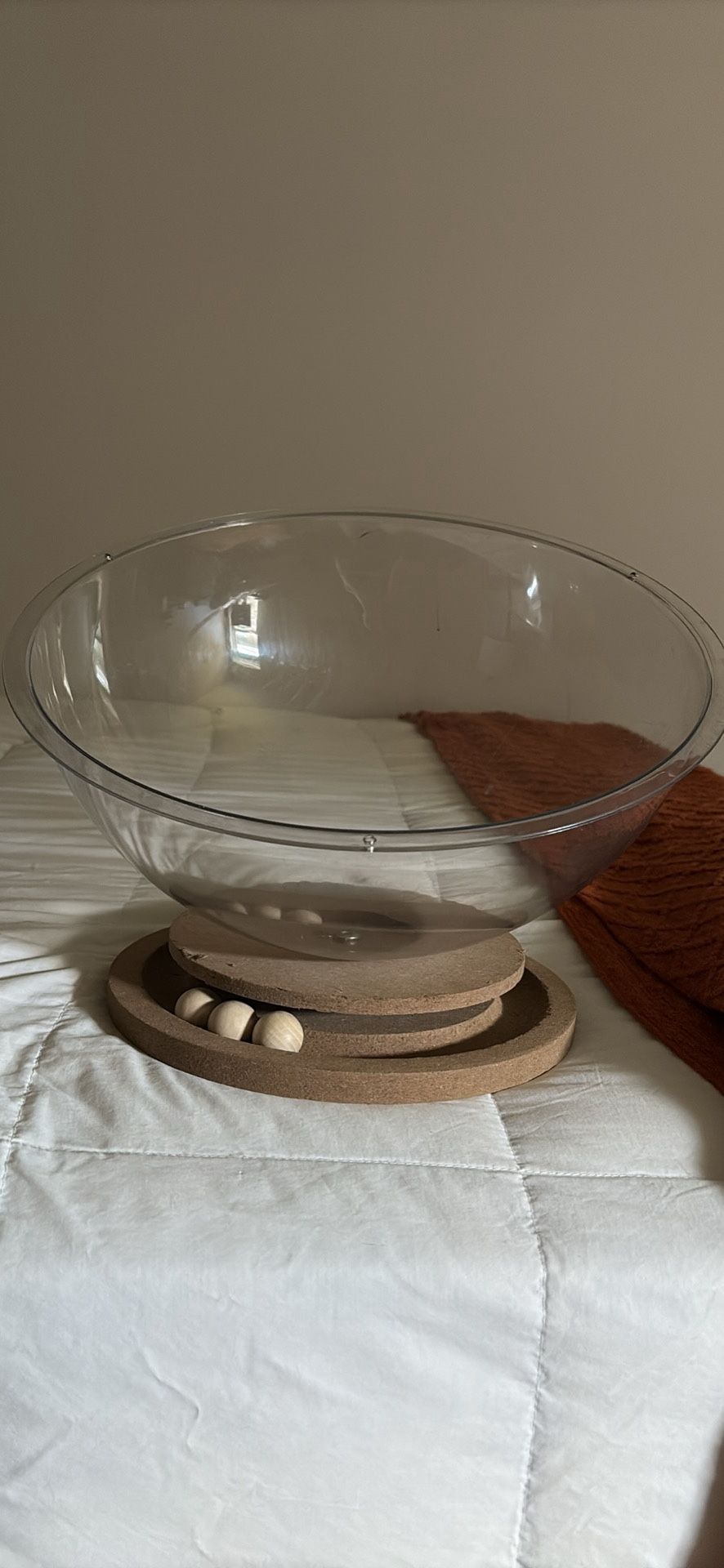 Clear cat bed with toy at the bottom