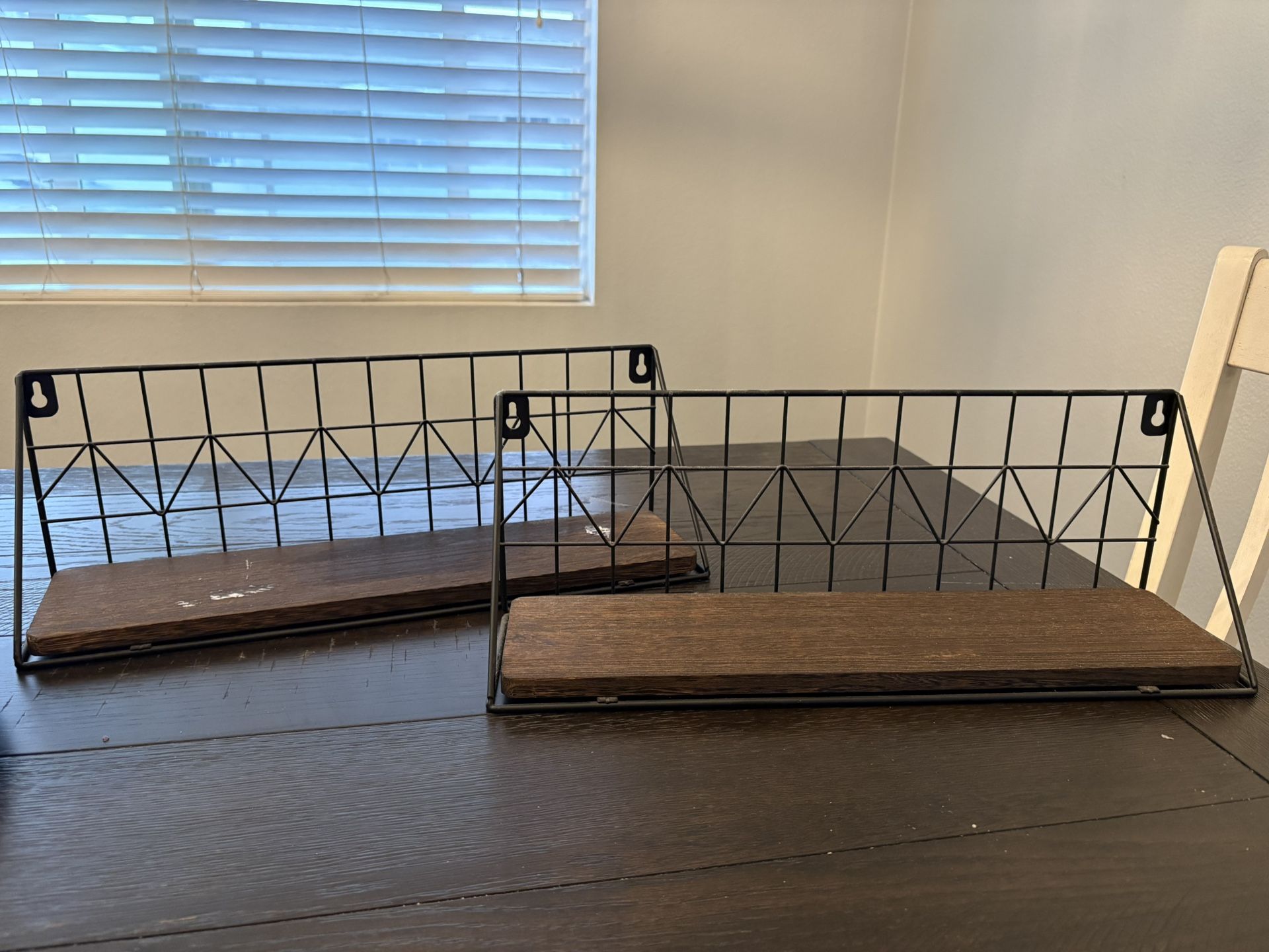 Set, black metal geometric and brown wood decorative shelves. One has some museum putty residue that could be washed or sanded off.