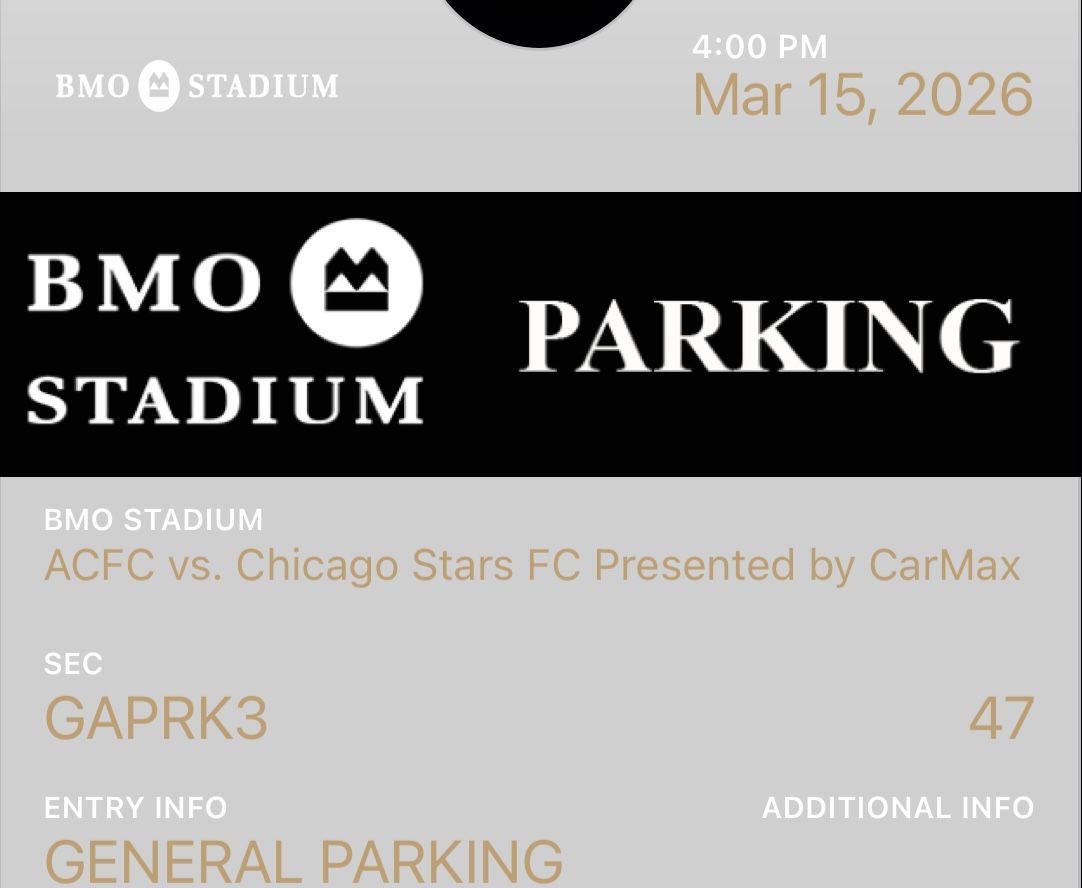 Selling a parking pass for Sunday, March 15 game! BMO parking stadium ACFC vs Chicago Stars