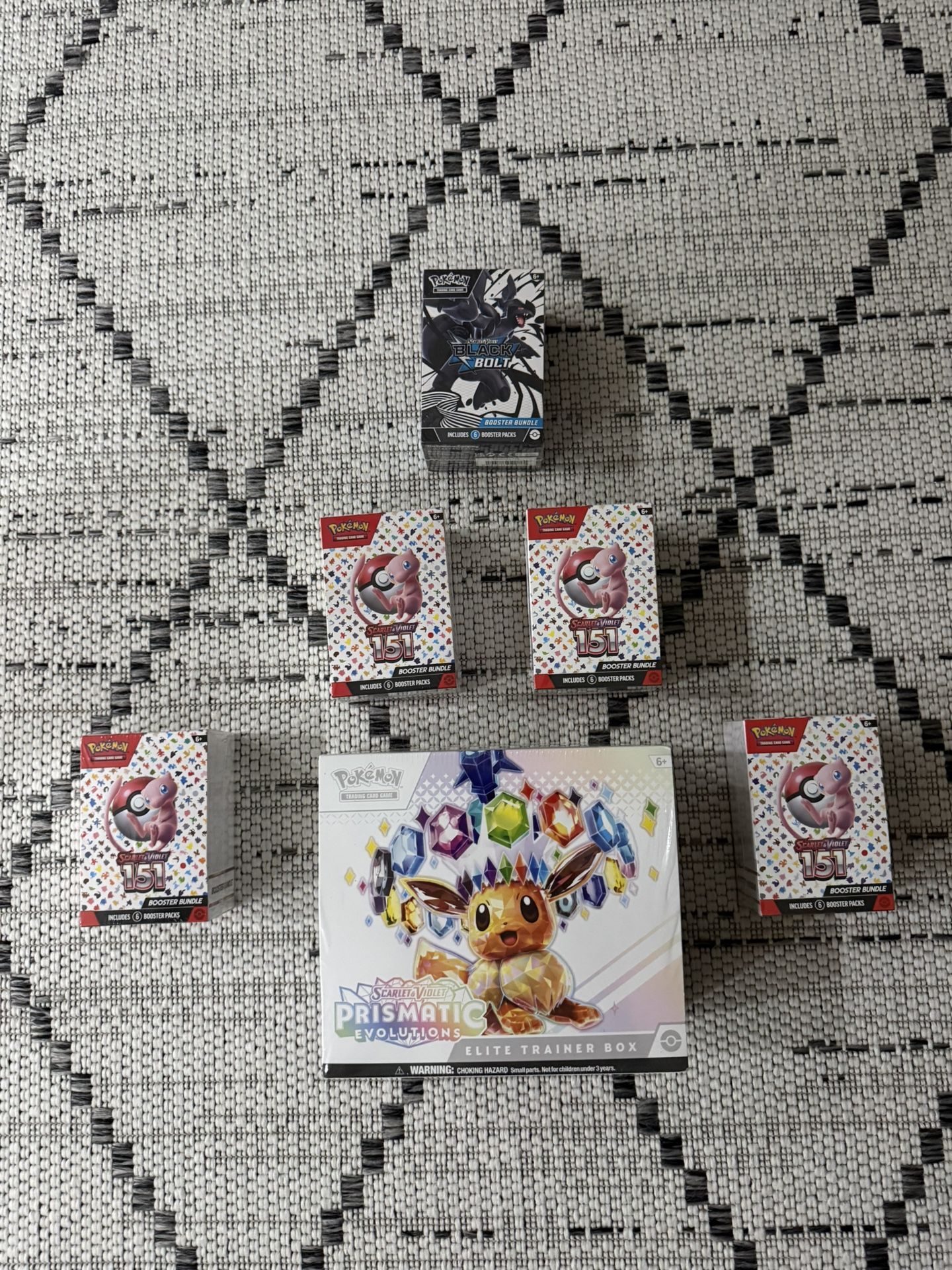 Prismatic Evolutions ETB: $150 151 Booster Bundle: $120 EACH Black Bolt Booster Bundle: $50