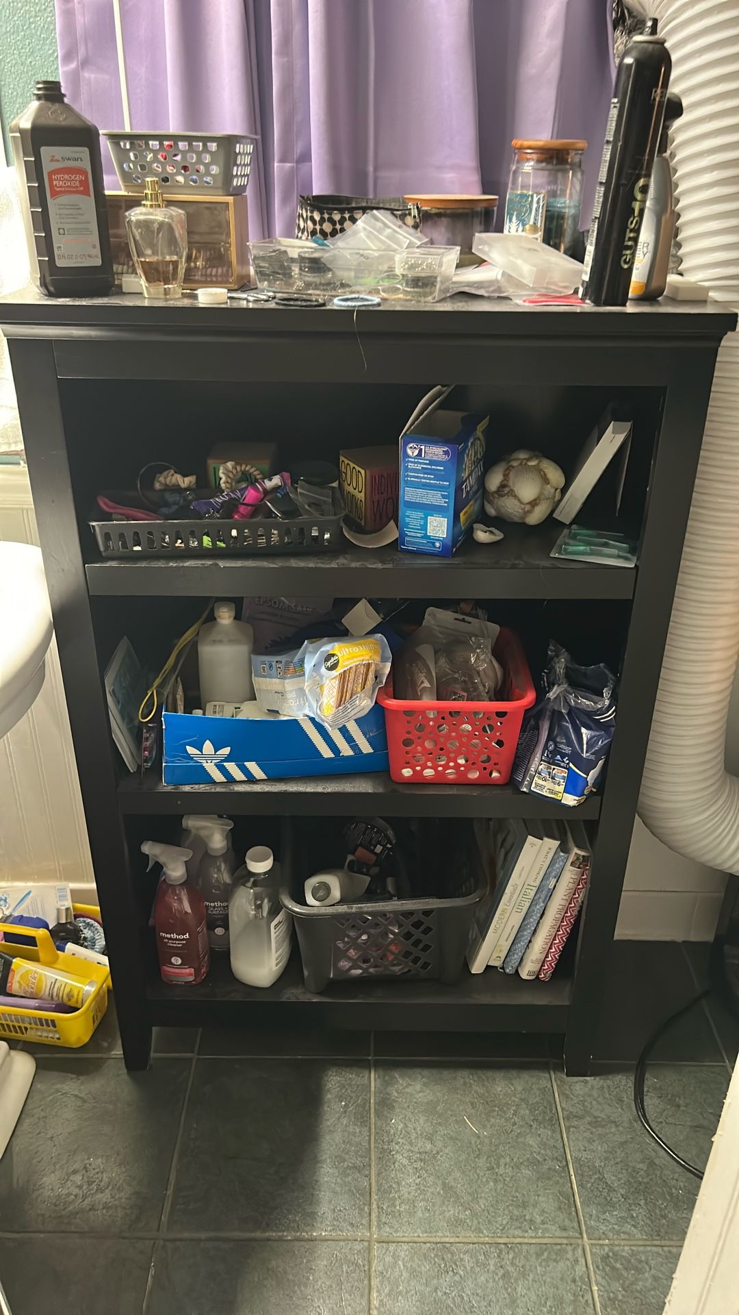 Black 4 shelf book case, very good quality, $200 new. One peg to hold shelf up missing. Can be bought at hardware store. Things on bookshelf not included.