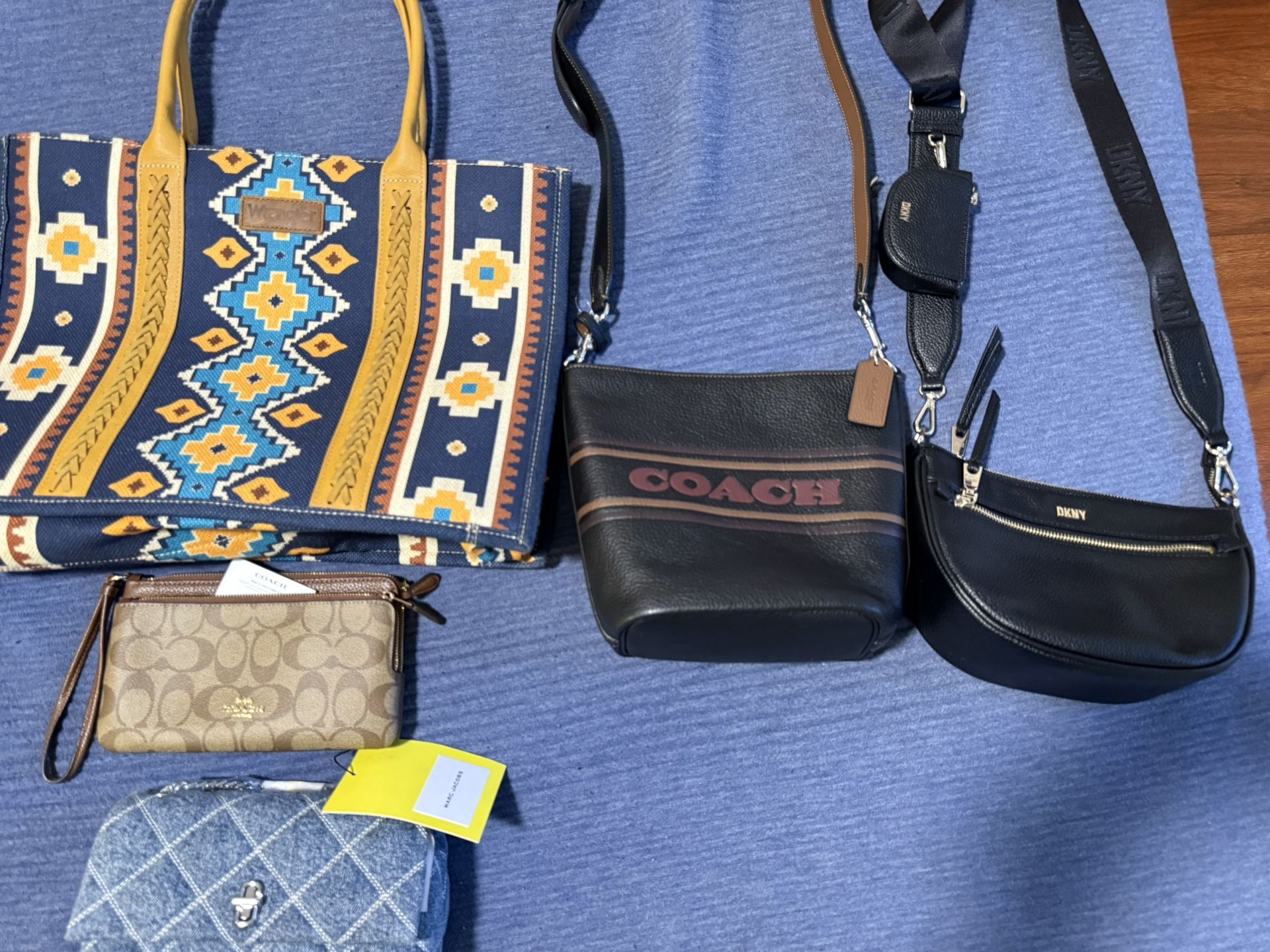 COACH PURSE NEW $60 COACH WALLET $50 MARC JACOBS NEW $60 DKNY PURSE USED ONCE $40 WRANGLER BAG USED ONCE $40