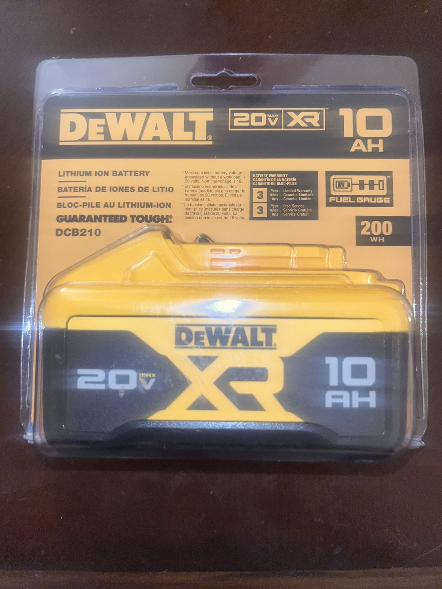 DeWALT lithium Ion- 10AH- 20v XR Model: DCB210 Description Item #: (contact info removed) | Model #: DCB210 Get the highest capacity within the DEWALT® 20V MAX XR® lineup with this DCB210 10.0Ah Lithium lon Battery. These batteries provide optimized runtime using state-of-the-art technology. Compatible with our new XR® Power Detect™ line of tools that adjust output based on power source, this battery delivers maximum performance to get the job done. Eliminate unplanned stops with an included LED Fuel Gauge charge indicator for added convenience. • LONGER RUNTIME: 10.0Ah (200 watt-hour) capacity helps increase productivity • VERSATILE USE: Compatible with 20V MAX tools and chargers • KNOW WHEN TO RECHARGE in advance with included 3-LED Fuel Gauge charge indicator • Manufactured by DEWALT