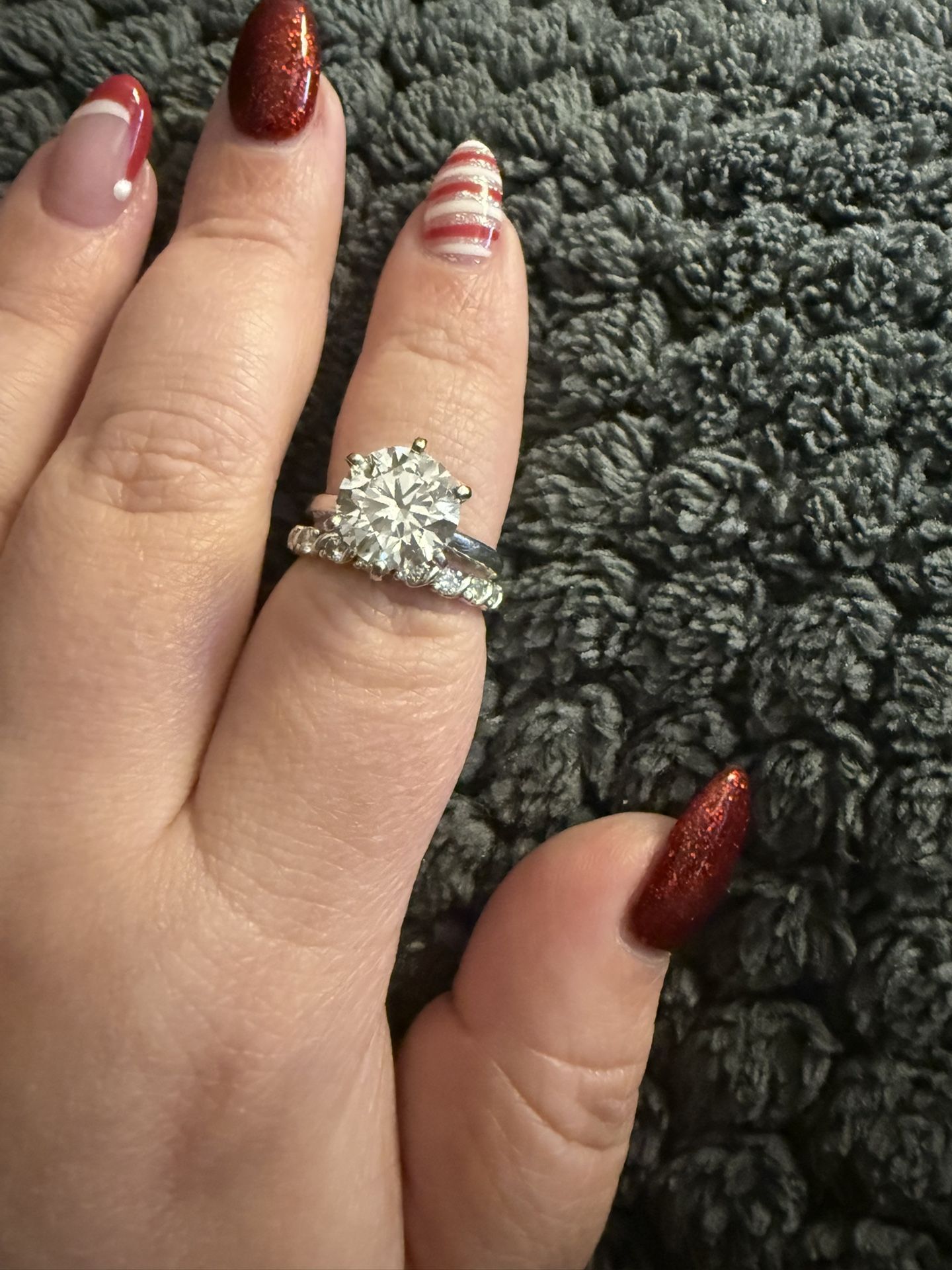 Beautiful 3.71 Kt E VS1 engagement ring in white gold 14kt and a diamond eternity band with it. My loss is your gain. Sz 7 and can be resized. Absolutely stunning in person. Posted a video showing the diamond being tested on diamond tester. Let me know if you have any questions. Thank you for your interest!