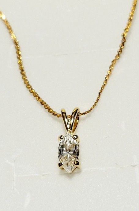 18 in. Chain Marquise Man-made gemstone. It's a crystalline form of zirconium dioxide that's hard & colorless. High quality & long lasting. Approximatley 1ct. This is not a genuine dimond. 18 ct over sterling.