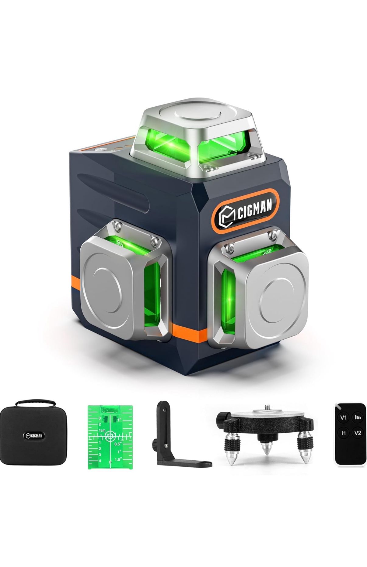 New !not opened! Not used lll CIGMAN Laser Level Self Leveling 3x360° 3D Green Cross Line for Construction and Picture Hanging, Rechargeable battery, Remote Controller, Magnetic Rotating Stand Included