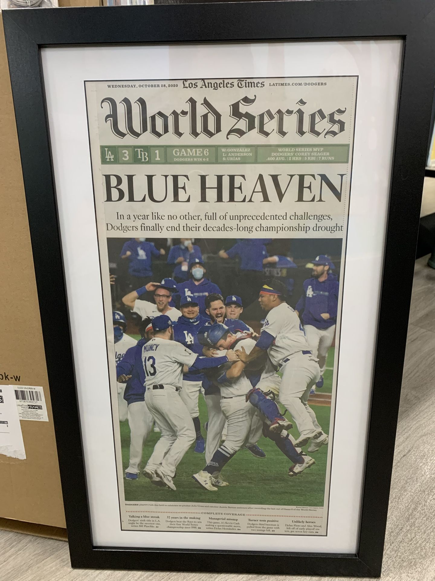 Selling a NEW never displayed Creative Picture Frames LA Times Dodgers 2020. The frame usually goes for $170. Size is 26”x 16”