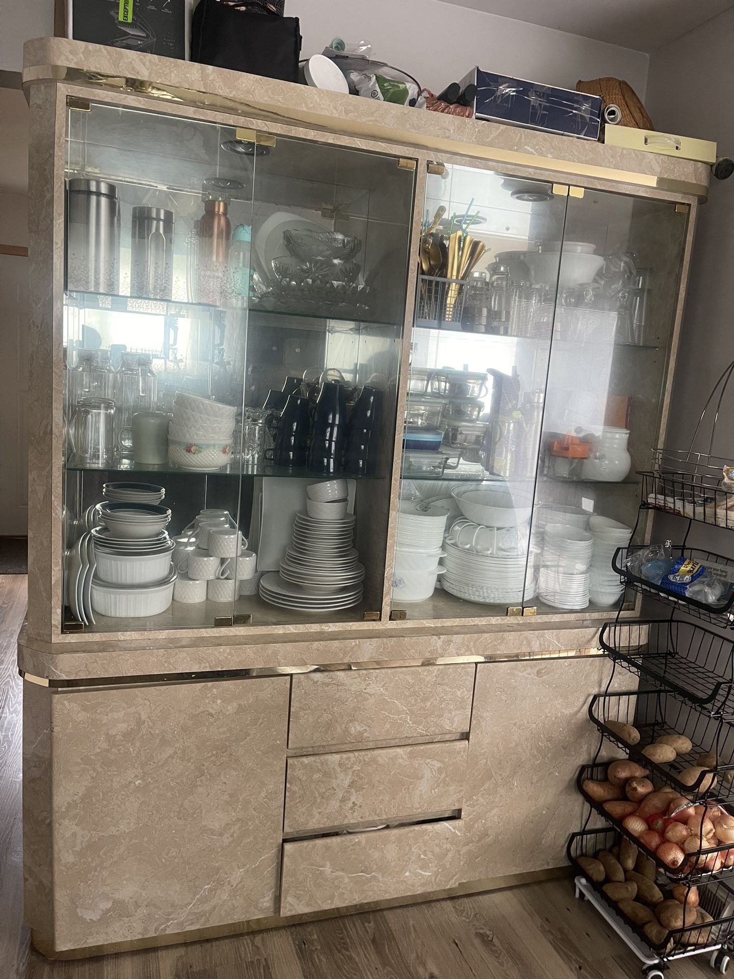 China cabinet Dinning table with 6 chairs Buffet table Dinning table Length 7ft 84” Width 3.5 42” Height 30” Buffet table 3.5 length 42” 18 width Height 31” China cabinet 80” height Width 66” 18 “ side width