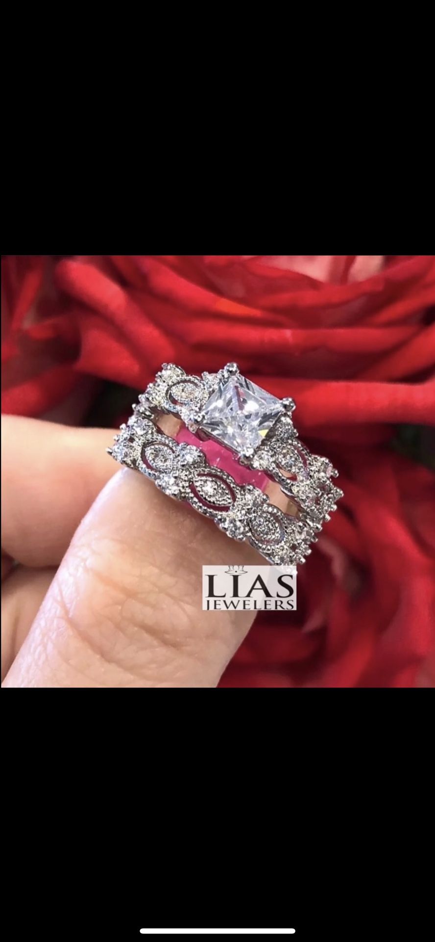 Brand new 18 k white gold filled wedding ring set, engagement ring. Available in most sizes! Also have men’s wedding ring, men’s wedding band, bridal set, engagement ring , wedding ring set