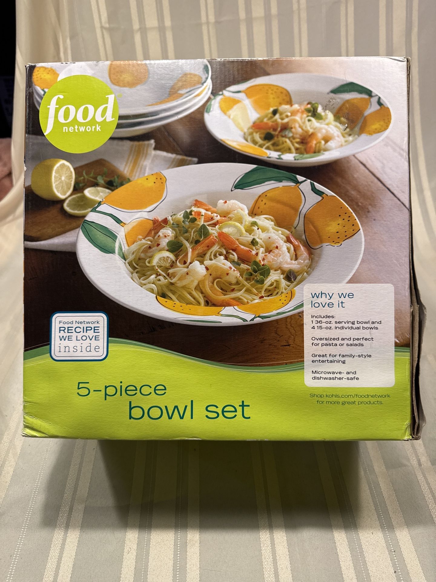 Bright and beautiful Food Network 5-piece lemon bowl set, perfect for pasta, salads, fruit, or family-style serving. Comes with 1 large 36-oz serving bowl and 4 matching 15-oz individual bowls. Microwave and dishwasher safe. Includes: • (1) 36-oz serving bowl • (4) 15-oz individual bowls Box is not prestine Pick up- SE Portland Cash only
