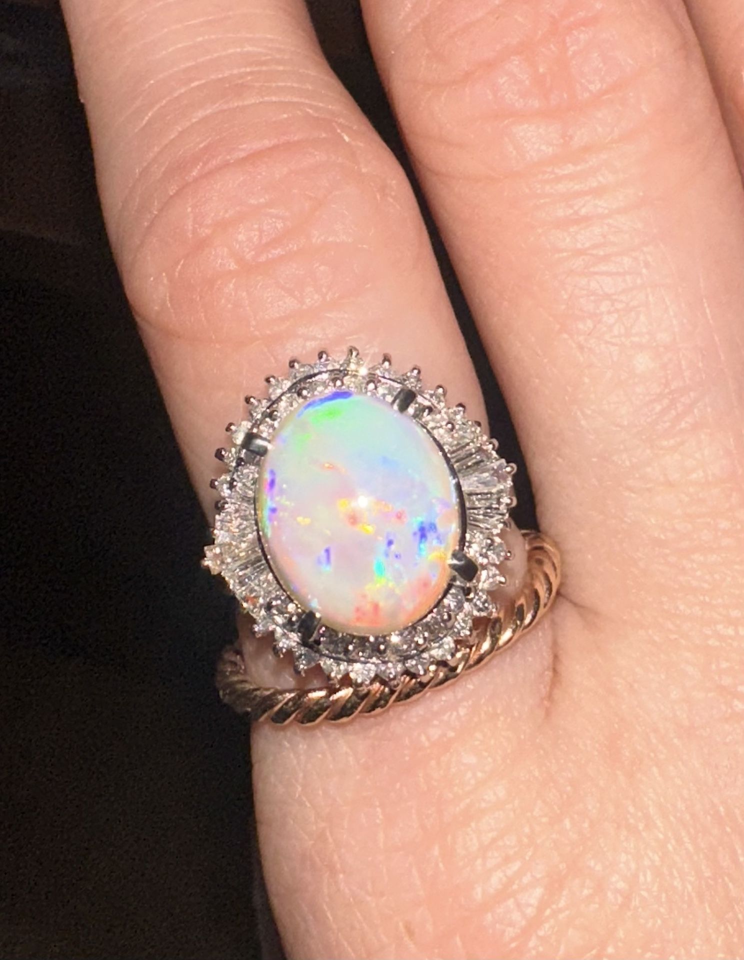 Preown Platinum Ring , 3ct Genuine Opal, .65ct Natural Diamonds - Estate Sale, beautiful opal- Bright patches of green, yellow, red, blue, and violet ,Located in encino Main Color : Platinum Sub Color : Whites Ring Size : US 4 1/2- can be sized Total Main Stone(s) : genuine Opal (cabochon) Total Main Stone Carat : 3.06ct Total Secondary Stone(s) : Natural Diamond Secondary Stone Carat : 0.65ct Material : Platinum Purity : Pt900 Gross Weight : 6.6 g / 0.232 oz