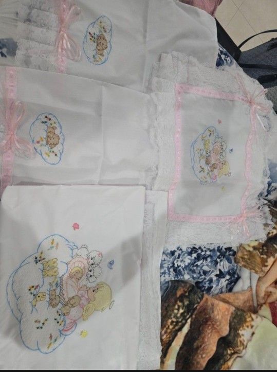 2 sets available $70 each. Hand embroidered Precious Moments crib or bassinet set. 2 simple decorated pillow cases, one embellished decorated pillow case, 1 large embroidered sheet.