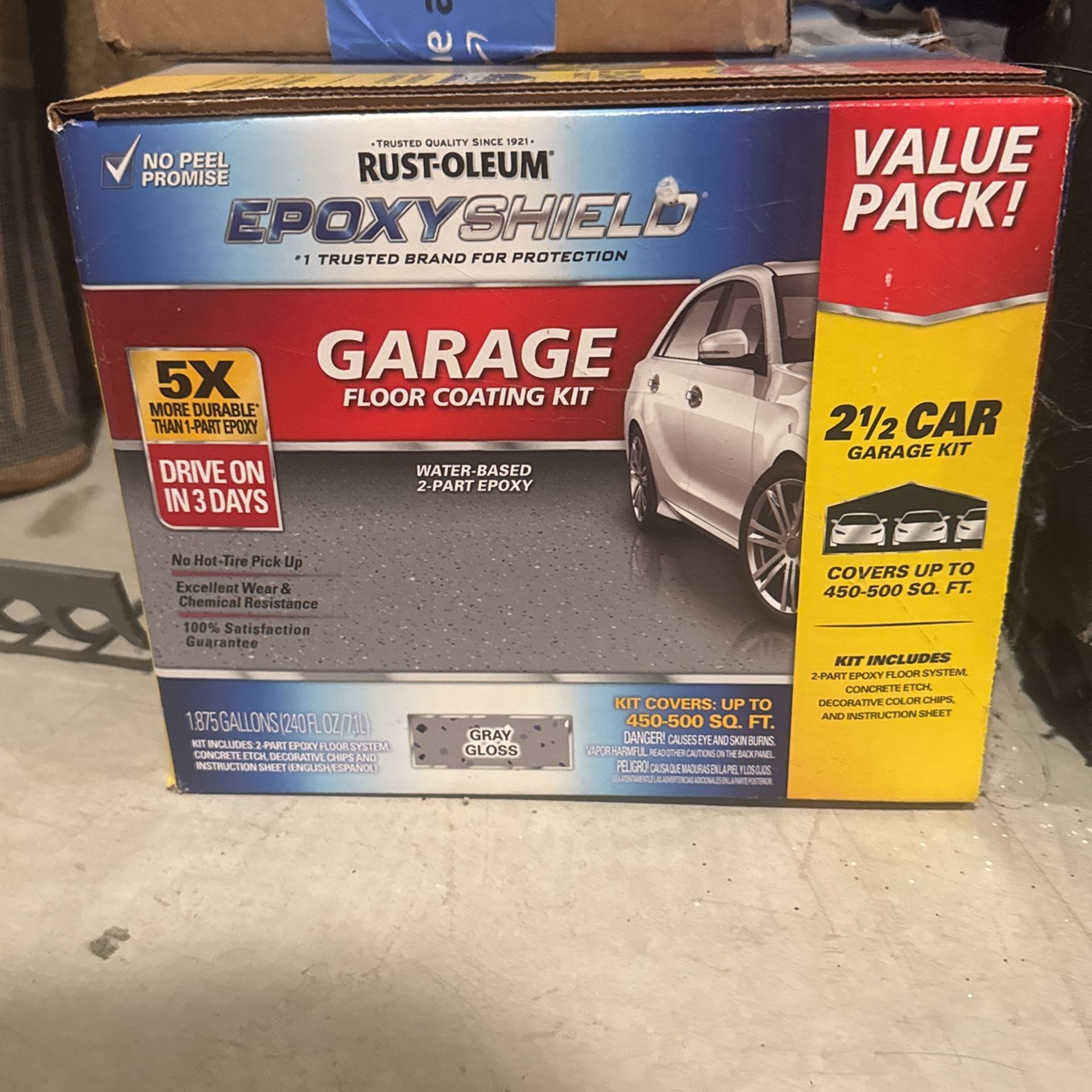 Garage floor coating. Gray gloss. Brand new from Home Depot. $180 original price. For 2 1/2 car garage.