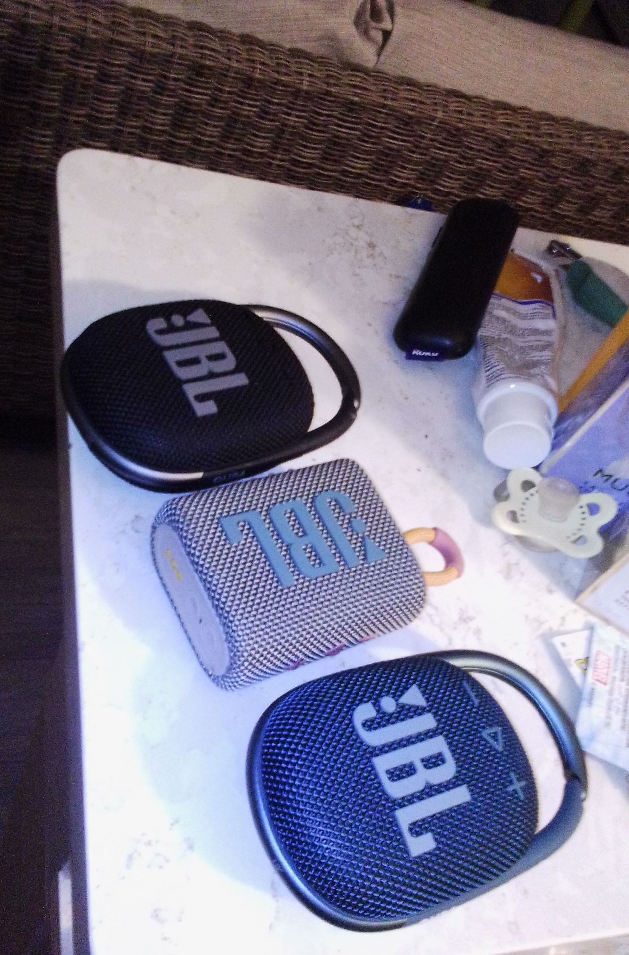 Three brand new JBL speakers, in the picture there is two brand new clip for JBL speakers all black and all navy blue the one in the middle is more retro colors very very cute, the retro colored JBL speaker that is in the middle of the other two speakers is the latest go3. $25 each speaker must buy all three. Once again must buy all three ** must pick up.