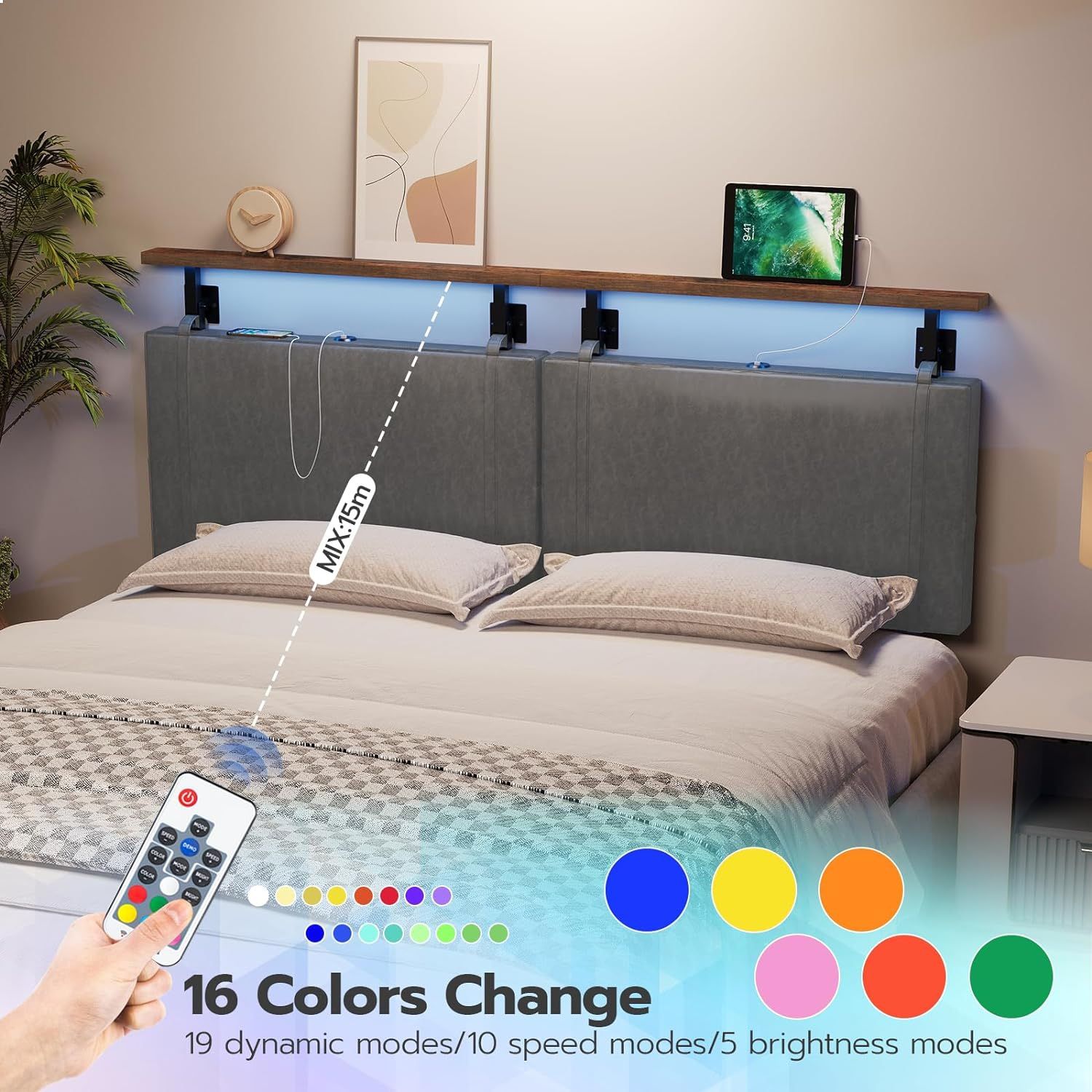 HOOBRO Headboard, Wall Mount Hanging Headboard with 4 USB Ports and LED Light, PU Upholstery, Open Storage Shelf, for Bedroom, Bar, Dining or Entryway, Queen Size, Rustic Brown and Gray Rustic Brown + Gray Queen