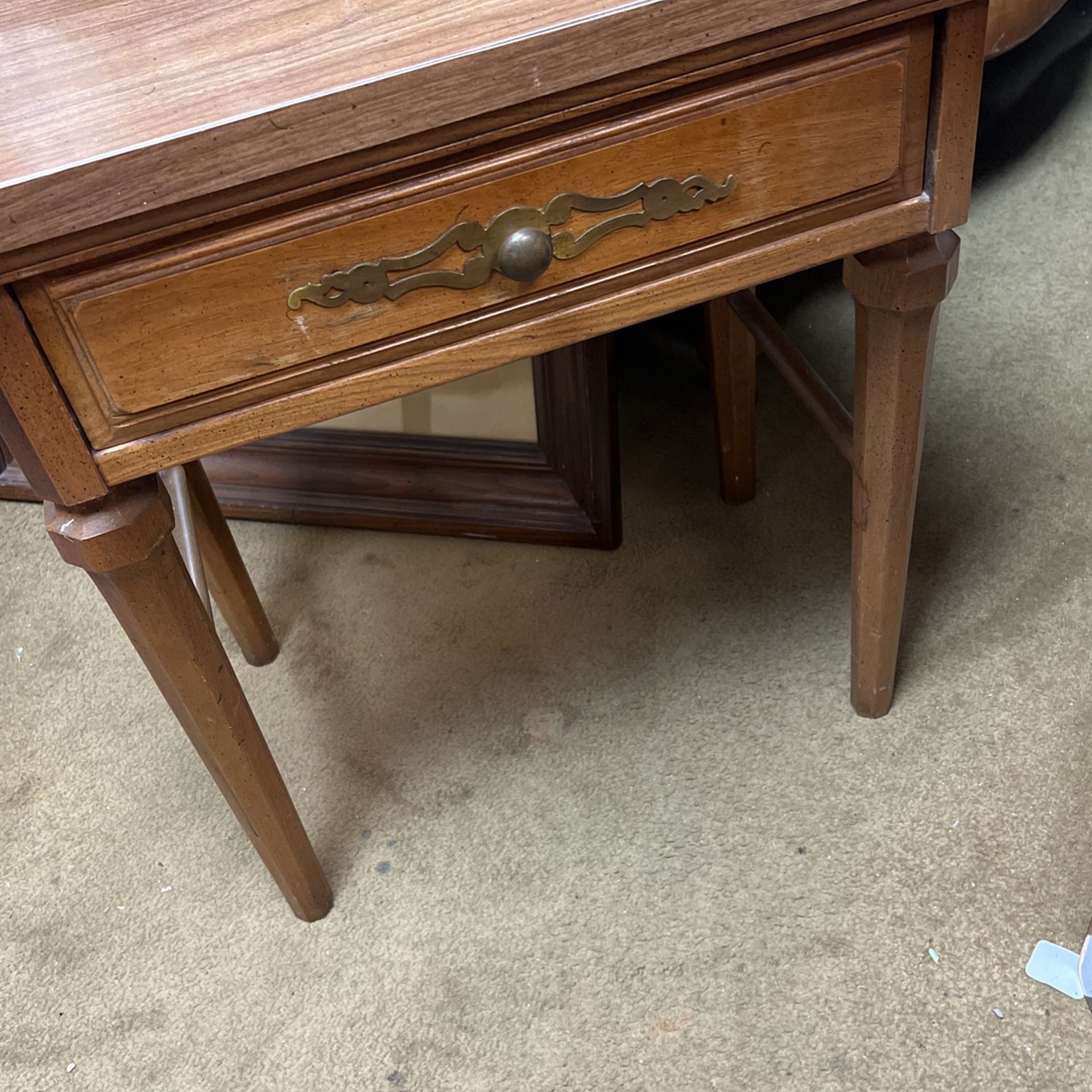 From the Stanley furniture company. Great condition. Real wood. Measures 22 inches wide by 15 inches deep and is 2 feet tall. Has one drawer.