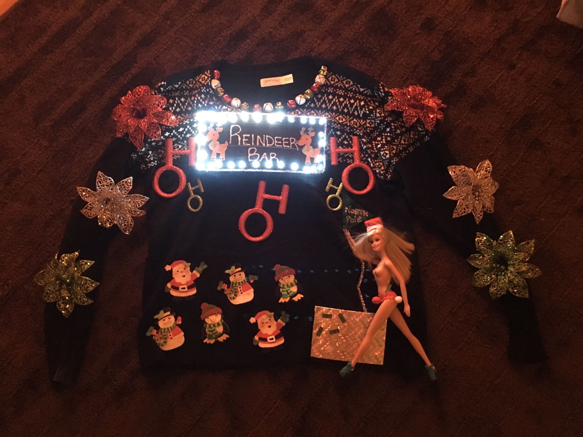 Just awesome! “Award winning” at an ugly Christmas sweater party. Woman’s XL (16-18). I bought a plain sweater and added all the decorations. There is a battery pack under the lighted sign which you will feel when worn, but it’s not at all uncomfortable.
