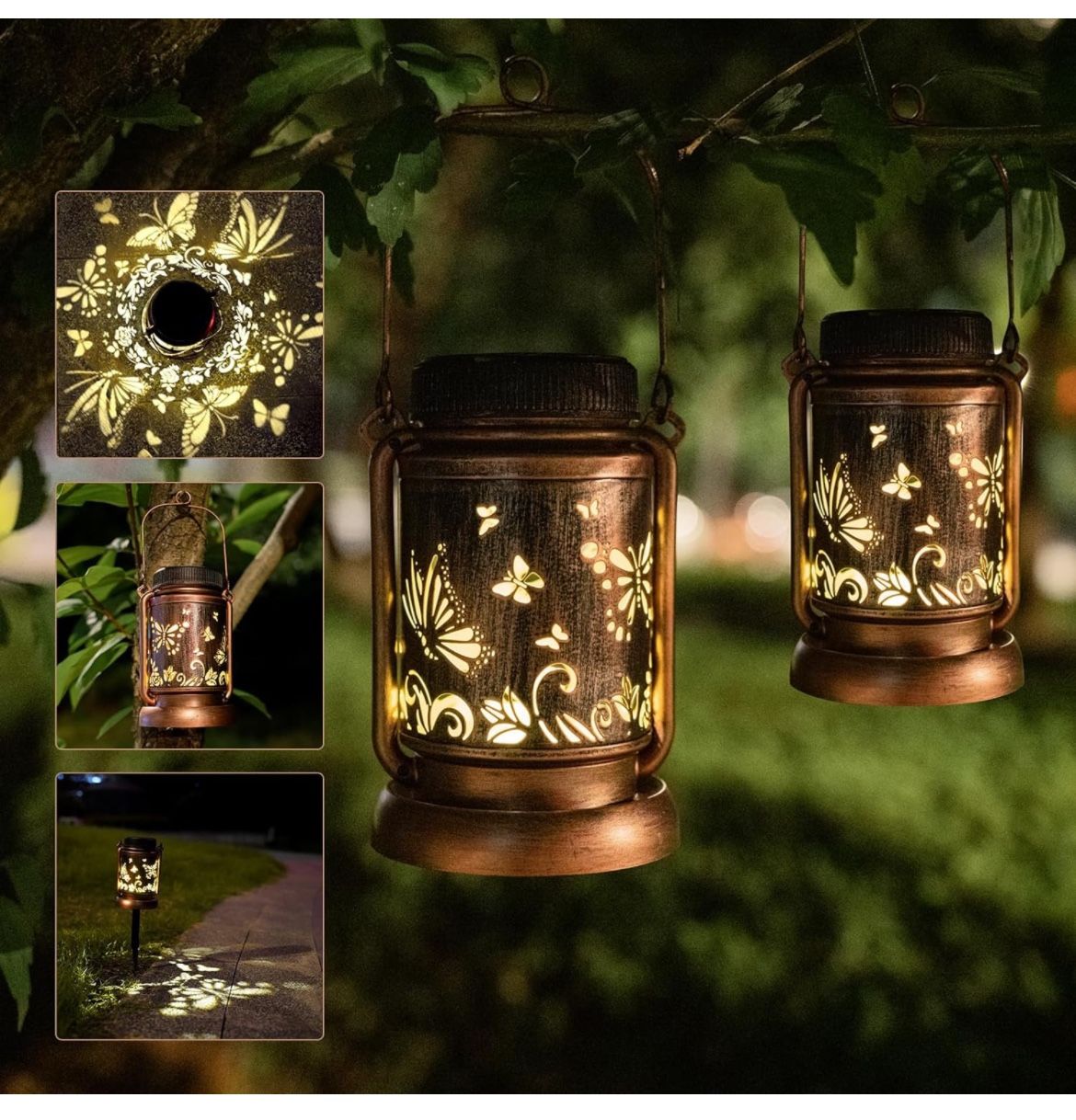 Solar Lanterns Lights Hanging Outdoor, 2 Pack Metal Waterproof Butterfly LED Decorative Light for Patio, Garden, Parks, Yard and Landscape as Gifts fo