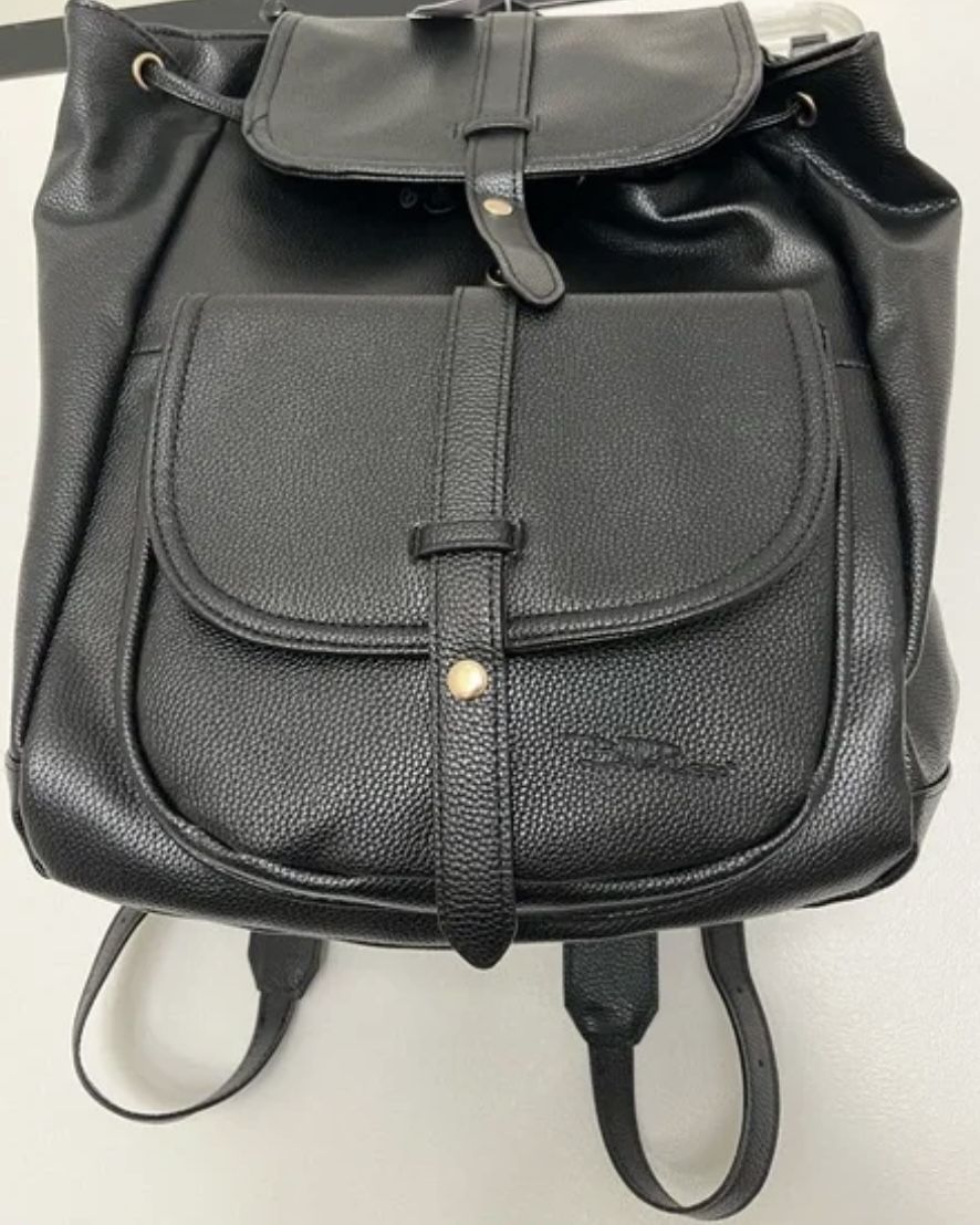 Adjustable straps Pebbled PU Leather drawstring backpack Interior zipper pocket Can be used for school, work, or diaper bag Snap closure pocket