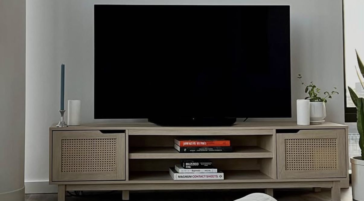 Beautiful neutral TV stand with rattan-style doors and open shelving. Slight warp on the rattan part (look at photos) Dimensions: • Length: 70” • Height: 17.75” • Depth: 14.5” 📍Pick up in Palos Park