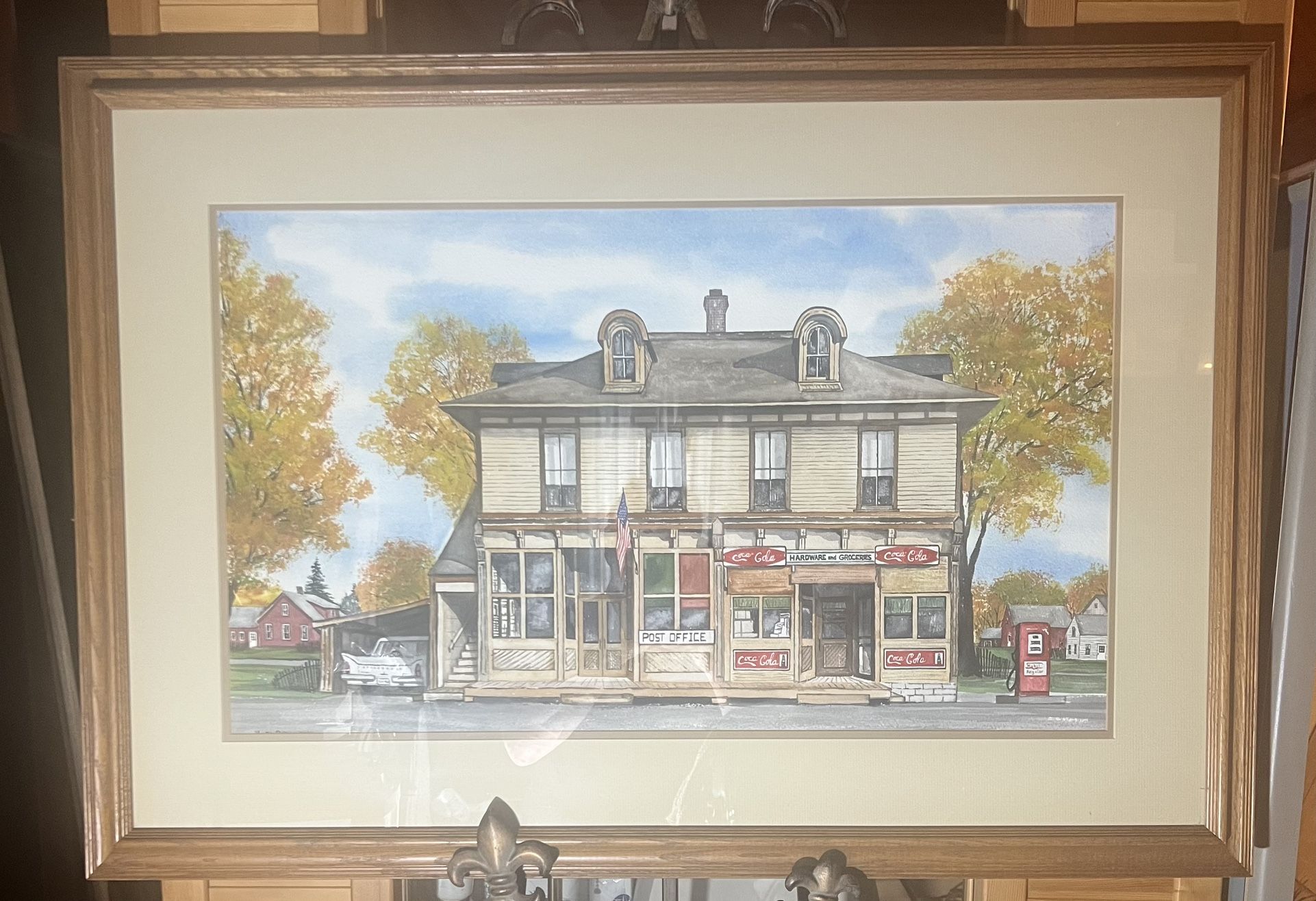 Watercolor Coca Cola Advertisement, Studebaker, Post Office. Gas Pump 39” X 27”