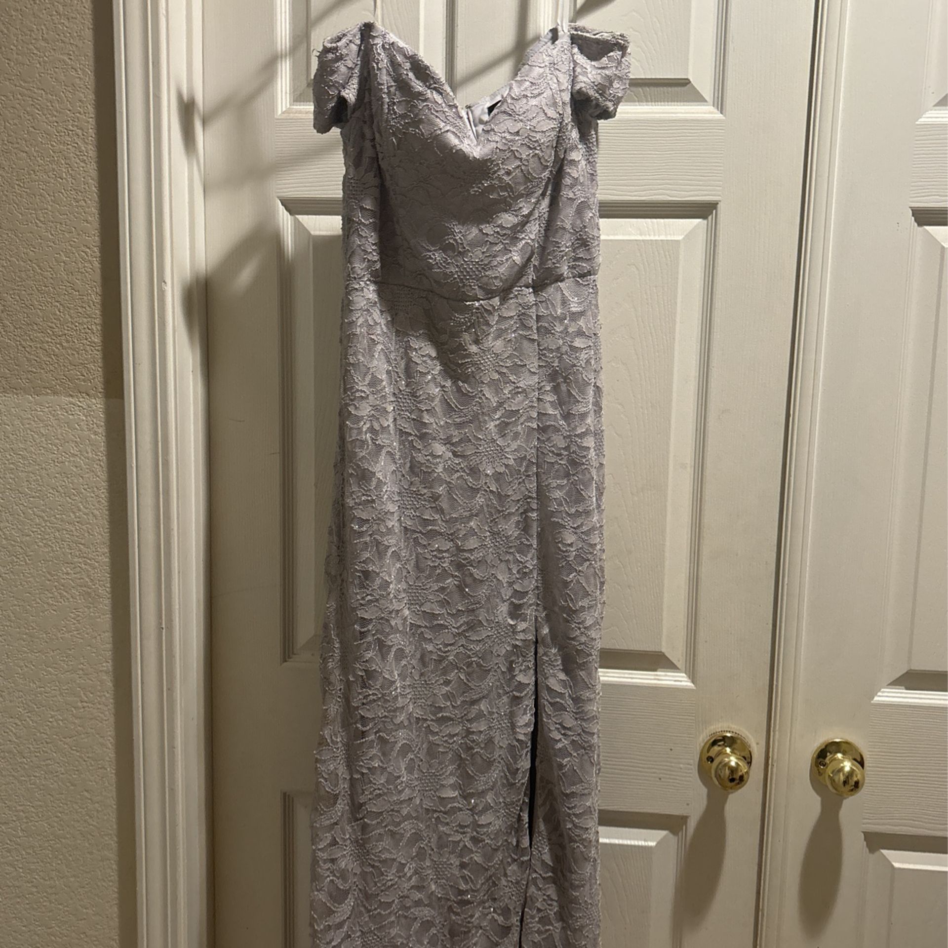 Silver formal fitted dress size 13/14 in junior. With a nice slit on left leg. Pictures don’t do justice. Great Buy!!