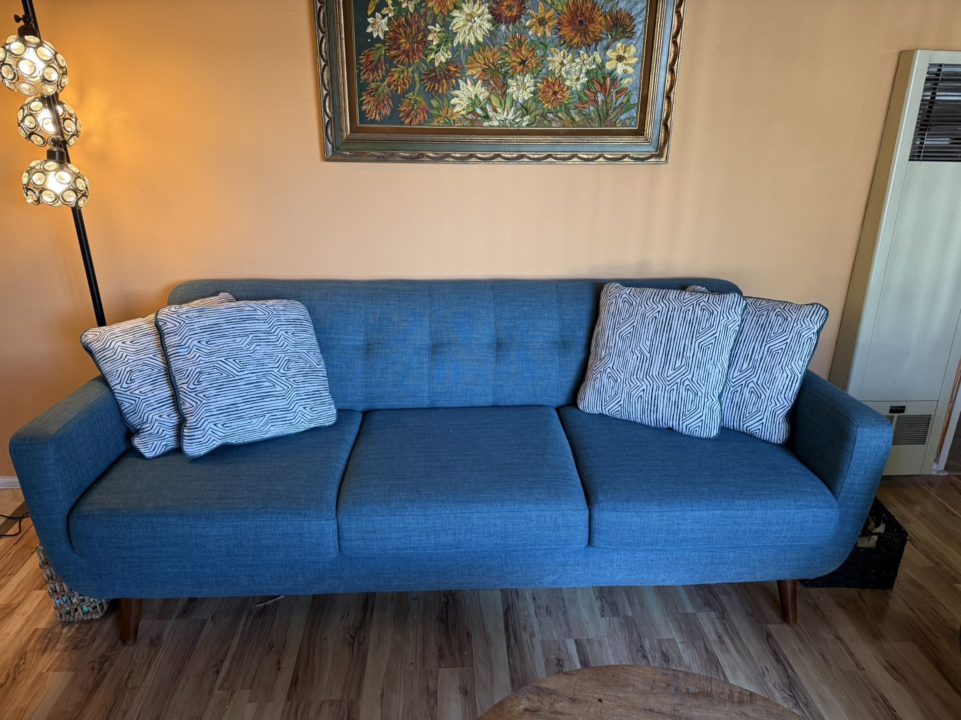 Modern blue sofa with matching single chair in excellent condition. Clean upholstery, comfortable seating, and a stylish contemporary look. Great for living room, apartment, or office setup. • Sofa seats 3 comfortably • Matching single chair included • Clean fabric, no stains or odors • Sturdy frame and legs • Smoke-free home Selling as a set only. Pickup required.