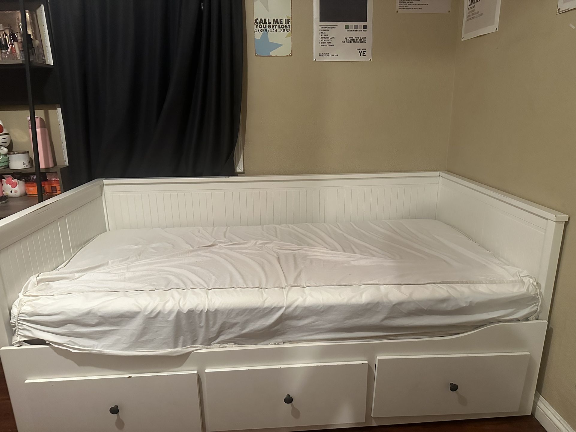 Good condition twin/queen size includes mattress all from IKEA it also come with a water proof cover