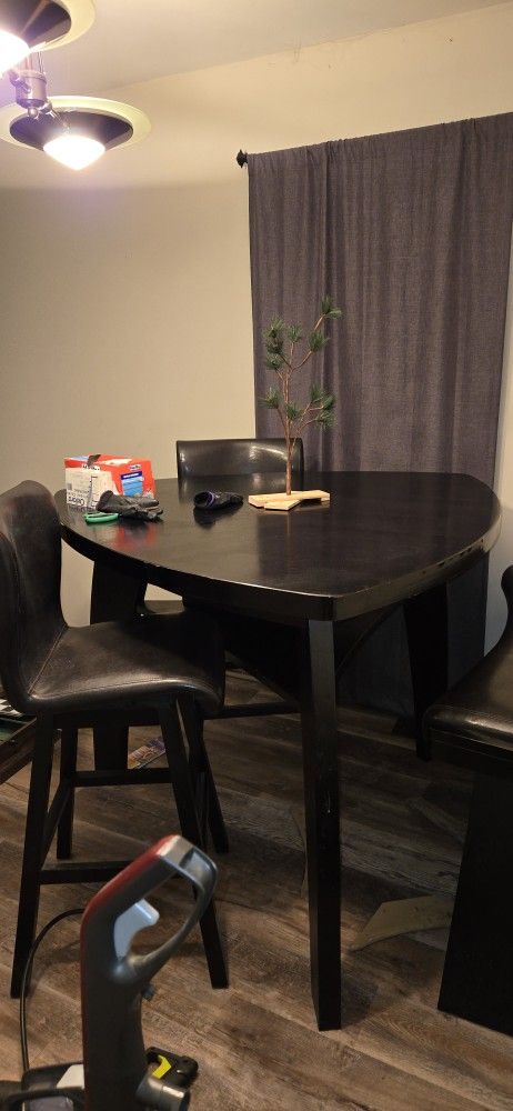 Expresso colored wood pub table with 2 chairs and high bench, good condition, beautiful set. Caah only, no scammers, all offers considered, must be picked up