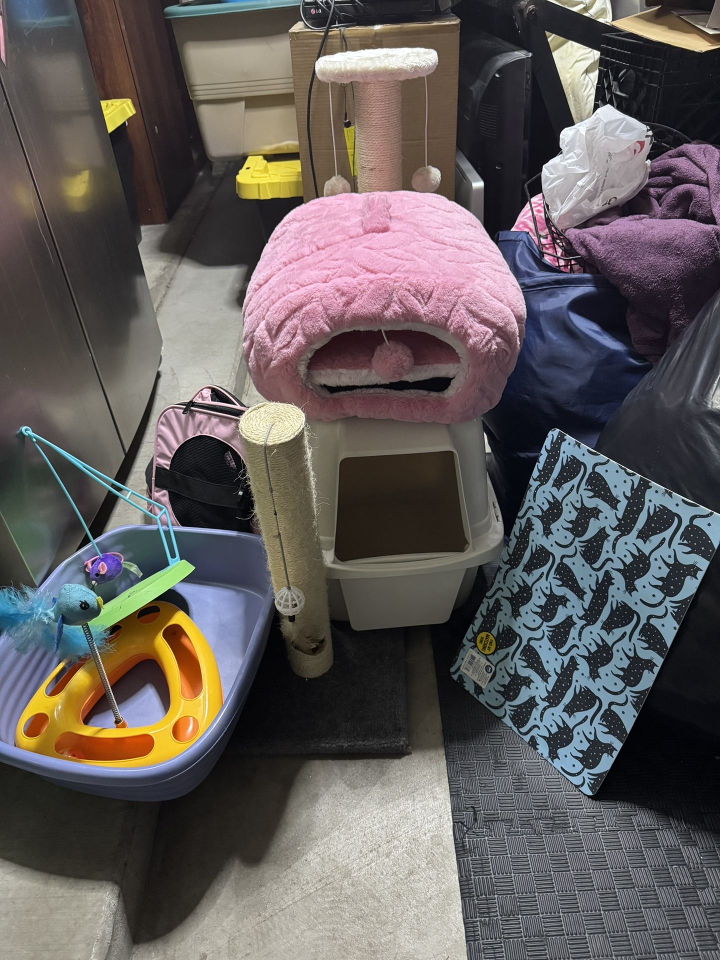 FREE to anyone who wants to pick it up. 2 cat toys, one open litter box pan, one litter box with lid, cat carrier, cat food/litter mat, 2 scratch posts, cat bed, electric water fountain, harness, food bowl, collars