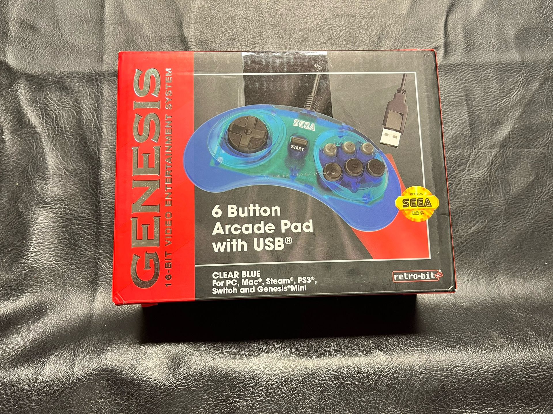 Clear blue, for MAC, Steam, PS3, Switch, and Genesis Mini. 10 ft cable, classic 6 button layout