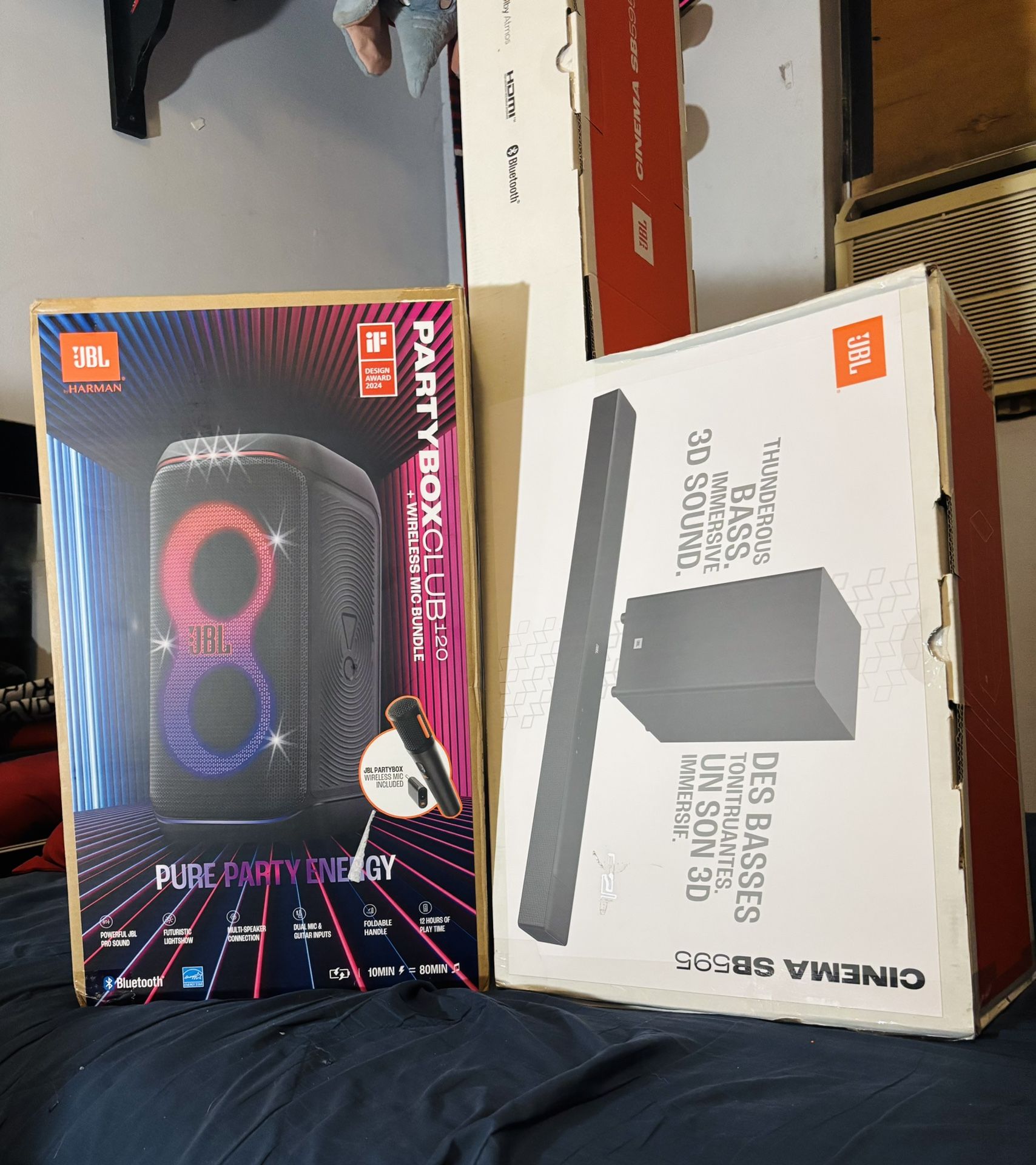 ⚡ NEW, OPEN BOX, VERIFIED, EVERYTHING INCLUDED IN BOX ⚡ READY FOR PICK UP ⚡ MESSAGE ME FOR ANY QUESTIONS ⚡ Se Habla Español, AS WELL ⚡️⚡️⚡️ BUNDLE INCLUDES ⚡️⚡️⚡️ JBL PartyBox 120 portable party speaker JBL Cinema SB595 3.1.2 Dolby Atmos soundbar Wireless subwoofer for home theater system • Connectivity: Bluetooth, HDMI ARC / eARC, Optical, USB • Sound profile: Deep bass, immersive Dolby Atmos surround sound, loud party-level audio • Dimensions (Approx.) PartyBox 120: 24.6” H × 11.7” W × 12.8” D Soundbar: 40.0” W × 2.5” H × 4.0” D Subwoofer: 8.3” W × 15.0” H × 10.0” D FEATURES & SPECS— • Premium entertainment bundle combining the JBL PartyBox 120 portable party speaker with the JBL Cinema SB595 3.1.2 Dolby Atmos home theater soundbar system. • Two powerful JBL systems in one package — one built for cinematic surround sound and the other designed for loud, energetic party environments. • JBL PartyBox 120 delivers signature JBL Pro Sound with deep bass and high-volume clarity that can easily fill large rooms, backyards, and events. • Dynamic LED light show built into the PartyBox speaker synchronizes with the music to instantly create a party atmosphere. • Dual microphone and guitar inputs allow karaoke nights, live performances, DJs, and group entertainment. • Rechargeable battery on the PartyBox allows portable music playback for parties, gatherings, and outdoor events. • JBL Cinema SB595 soundbar features a powerful 3.1.2 channel Dolby Atmos home theater system designed for immersive movie and TV sound. • Up-firing Dolby Atmos height speakers create true three-dimensional surround sound that makes audio move above and around you. • Dedicated center channel ensures crystal-clear dialogue so voices remain sharp even during action-heavy scenes. • Wireless subwoofer delivers deep cinematic bass that dramatically improves movies, sports, and gaming audio. • Bluetooth streaming on both systems allows quick connection to phones, tablets, and laptops for music playback. • HDMI ARC / eARC connection allows a simple one-cable connection to your TV with high-quality audio transmission. • This bundle provides both a powerful home theater upgrade and a high-energy party speaker system in one purchase. • Perfect for movie nights, gaming setups, backyard parties, DJs, karaoke nights, family gatherings, and large entertainment spaces