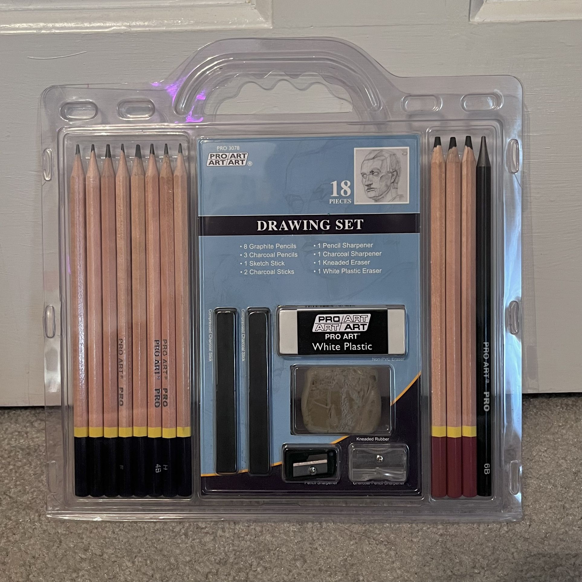 Gently used pencil set for drawing & sketching! No major signs of use except for the kneaded rubber. Everything else is in great, gently used condition! Please review all photos carefully for the condition of this item prior to purchasing! This set includes 18 pieces: - 8 Graphite Pencils - 3 Charcoal Pencils - 1 Sketch Stick - 2 Charcoal Sticks - 1 Pencil Sharpener - 1 Charcoal Sharpener - 1 Kneaded Eraser - 1 White Plastic Eraser