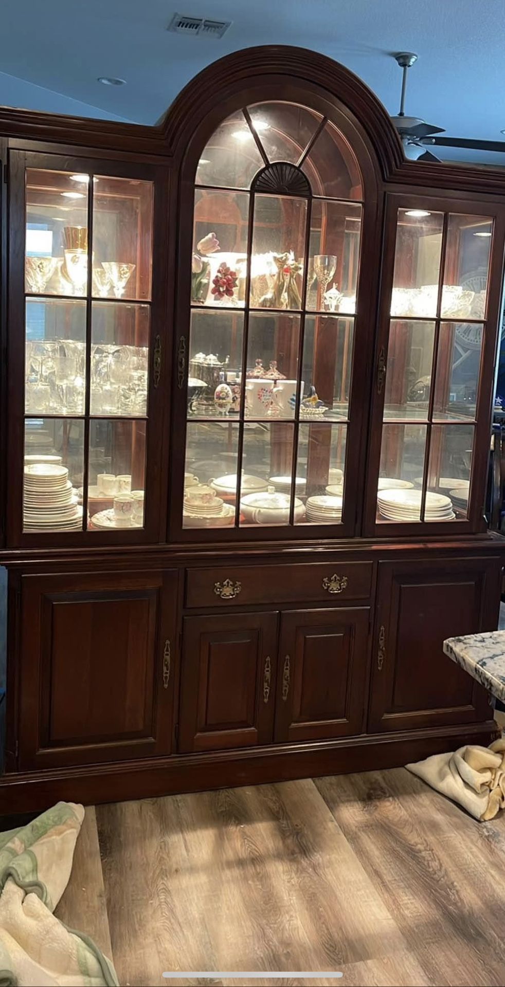 A beautiful hutch with lights. Very heavy, will need to bring help. There are 2 pieces Top 61Lx16wx57h Bottom 66Lx16wx30h