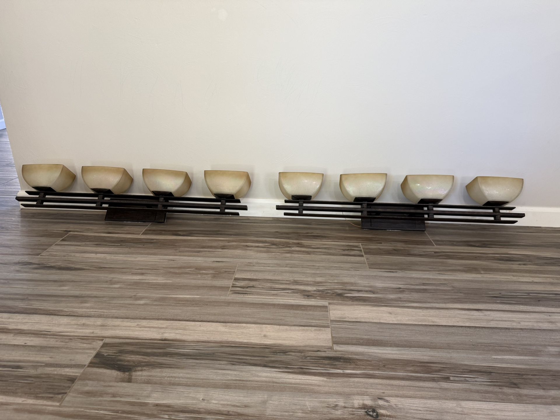 Price: $100 Set of two modern wall sconces with frosted glass shades that have a subtle iridescent glow. Clean, contemporary design with metal mounting bars. These give off a really beautiful, soft light and work great in a hallway, bedroom, bathroom, or living space. Both are in good working condition. Normal light wear from previous use. Bulbs included. Perfect for modern, contemporary, or minimalist interiors -very Restoration Hardware / West Elm style. Pickup in northwest Tucson. Cash or Venmo.