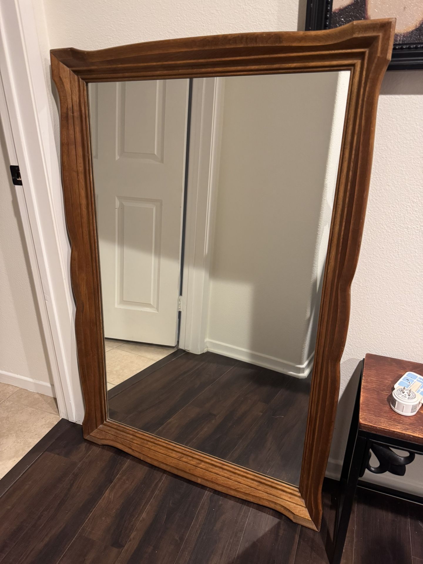 Very large beautiful real wood mirror for sale. This thing is heavy and very well kept. Size is in the photos. Asking 60. Thank you!