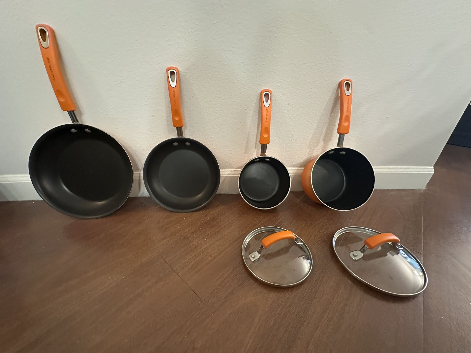Moving sale! 2 Rachel Ray pots with lids + 2 frying pans (orange with soft-grip handles). Nonstick surfaces in good used condition. Some wear on exterior but all pieces cook great. I have other extras like measuring cups and some utensils you can just have. First come first serv
