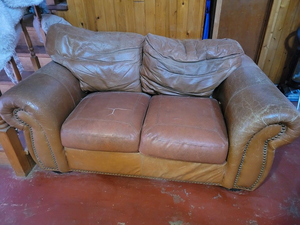Free. You pickup (bring help it's not light!) Normal cracks and wear in the leather. Still super comfy. Dusty from sitting off to the side. Only the weenie dogs used it cause we have our own chairs
