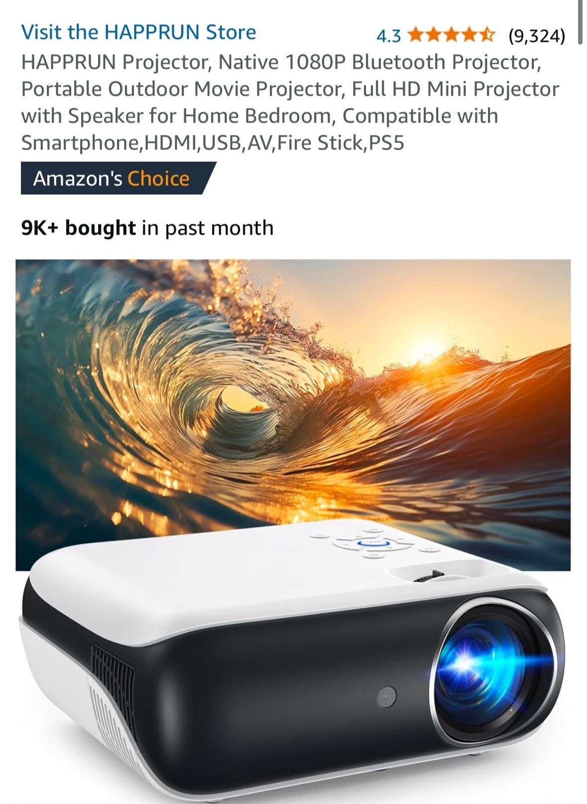 Happen Projector, Native 1080P Bluetooth Projector, Portable Outdoor Movie Projector, Full HD Mini Projector with Speaker for Home Bedroom, Compatible with Smartphone,HDMI,USB,AV,Fire Stick,PS5