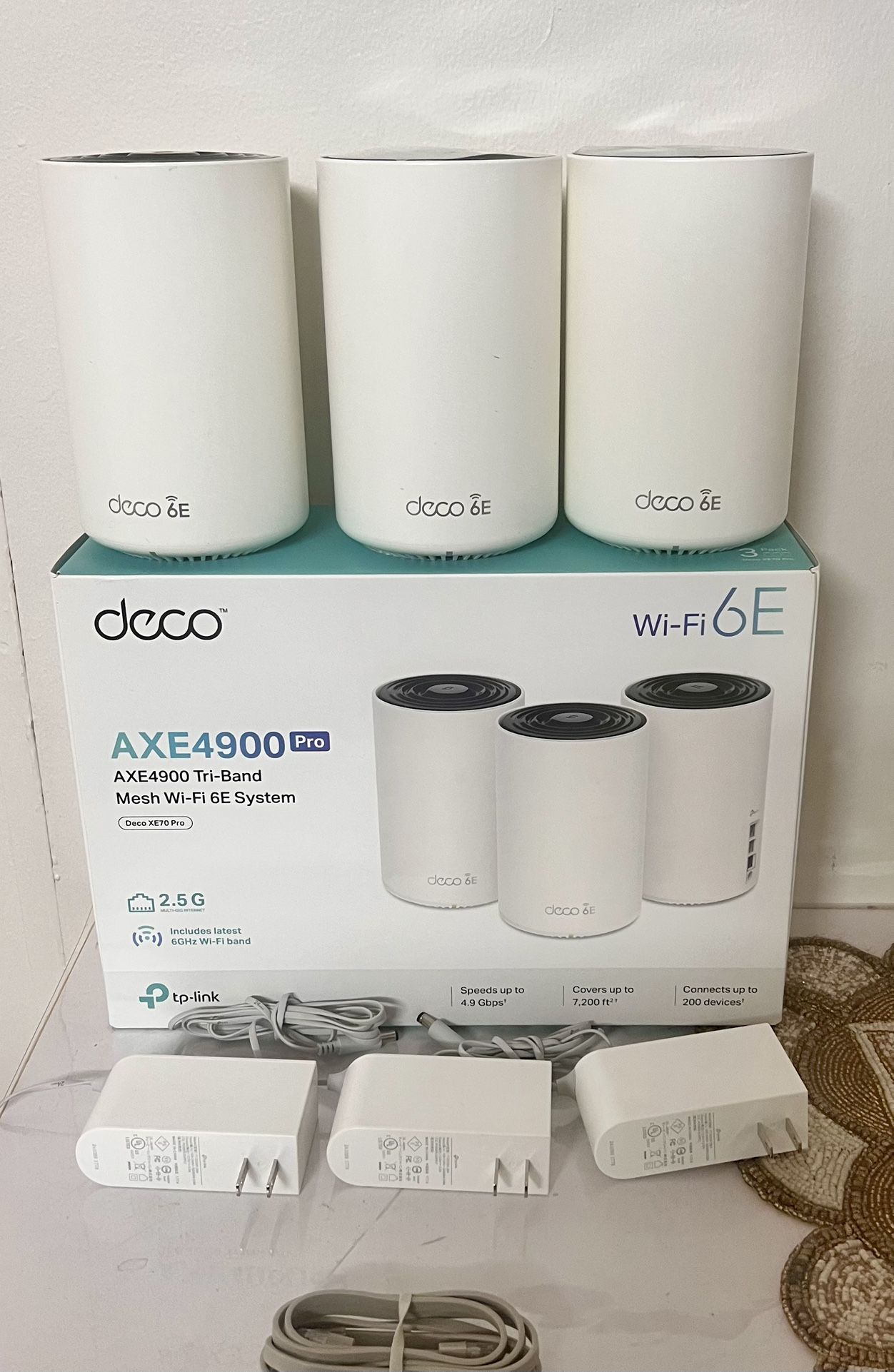 Router Mesh TP-Link Deco XE70 Pro AXE4900 3 Pack TP-Link Deco XE70 Pro AXE4900 Tri-Band WiFi 6E Mesh WiFi System - 2.5G WAN/LAN Ports, 4.9 Gbps Wi-Fi 7,200 Sq. Ft Coverage, Connect up to 200 Devices, 6 GHz Band, 3-Pack Comes with box Cash and local pick up only