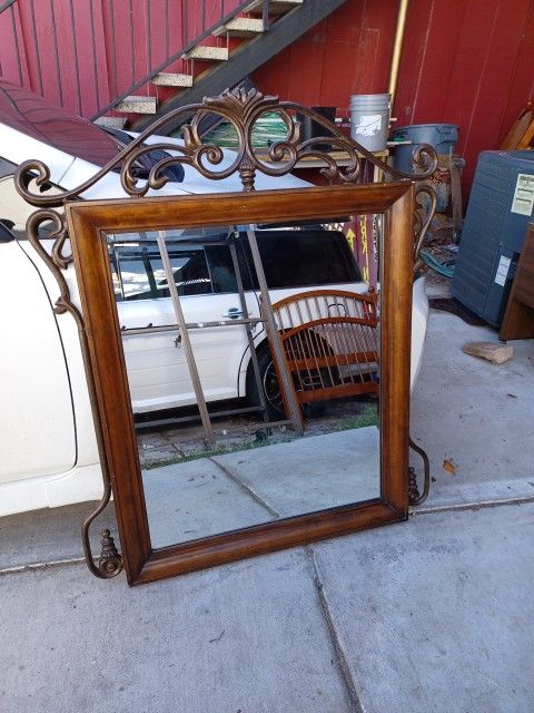 The nice large vintage solid oak and heavy metal framed dresser mirror is still in basically good condition. There are no large scratches, nicks, cracks, dents or other damage on the solid oak and heavy metal frame part of the mirror. And there are no large scratches, cracks or other damage on the mirrored glass part of the piece. We are located on South Eastern Ave near Russell Rd. The price is firm.