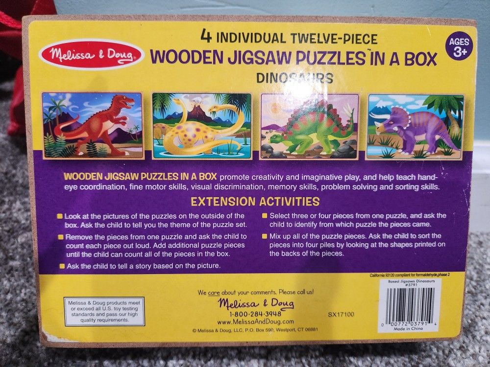 Selling Melissa & Doug wooden puzzle set. There are 4 puzzle sets with 12 pieces each. It's in a very sturdy wooden book. Everything intact,no lost pieces,no rips ,no cracks, Is in AS new condition. Selling for $20 -$25 new. Grab a bargain.