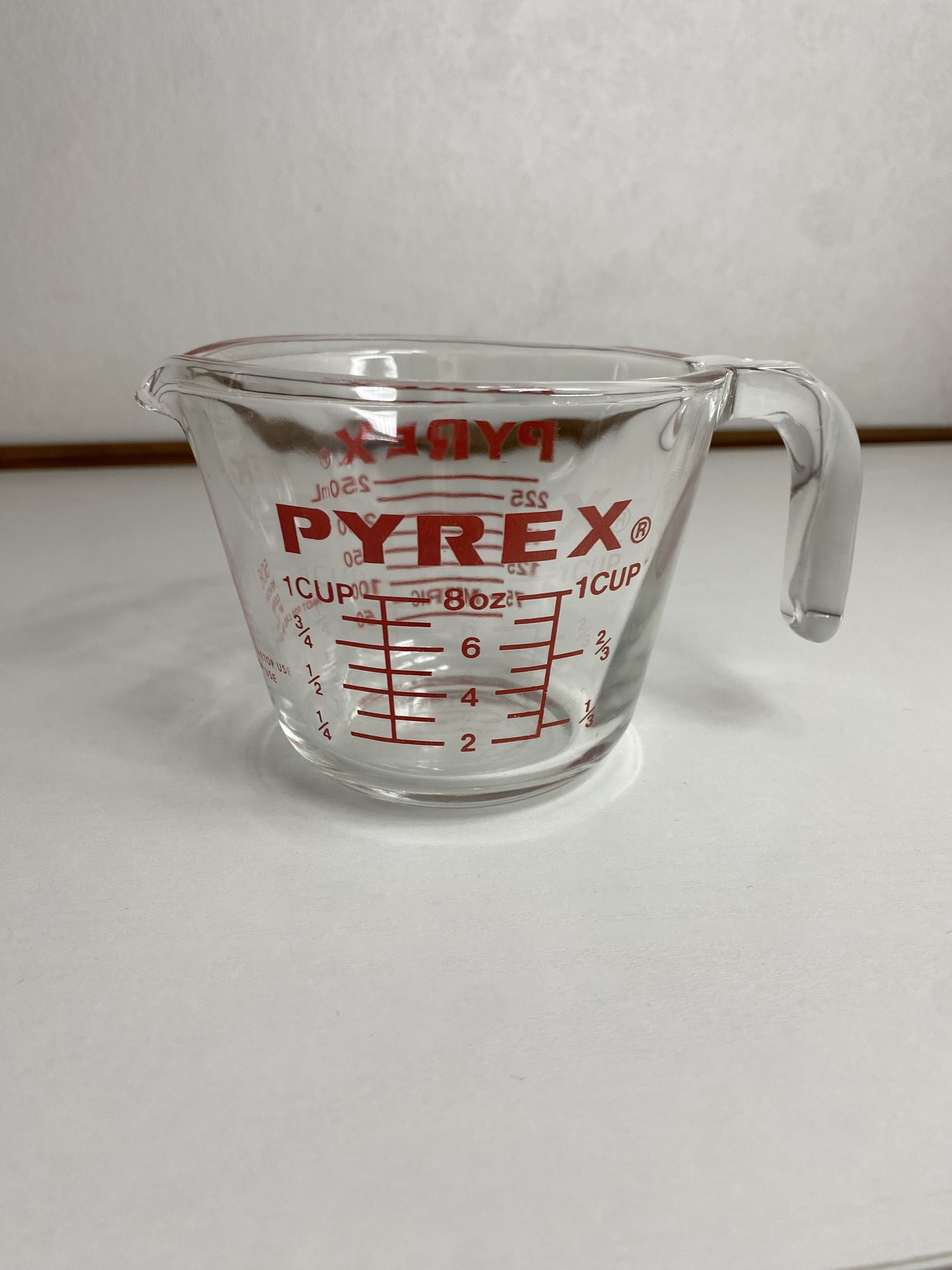 Vintage Pyrex Clear Glass, Red Markings Measuring 1 Cup, #508, Corning NY USA. In good condition no chips or cracks just stains on the inside bottom
